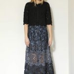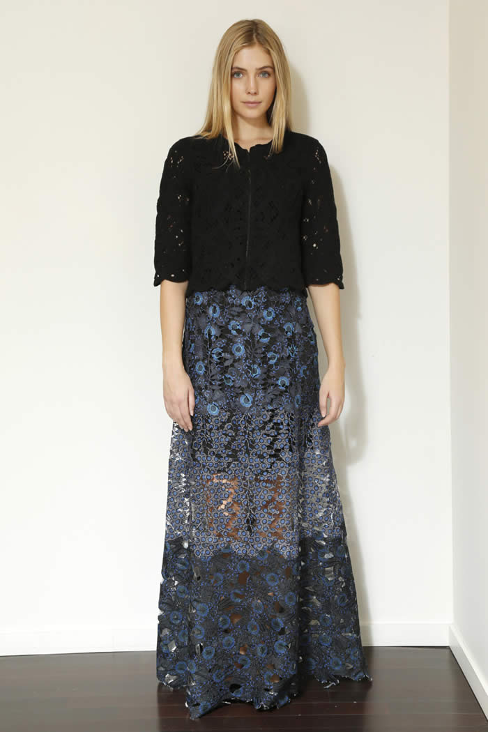 Elie Tahari channeled a “folk modern” spirit for pre-fall, updating his long, lean Seventies silhouettes hink flared pants and maxiskirts in sheer embroidered lace and crochet, some looks adorned with floral appliqués.