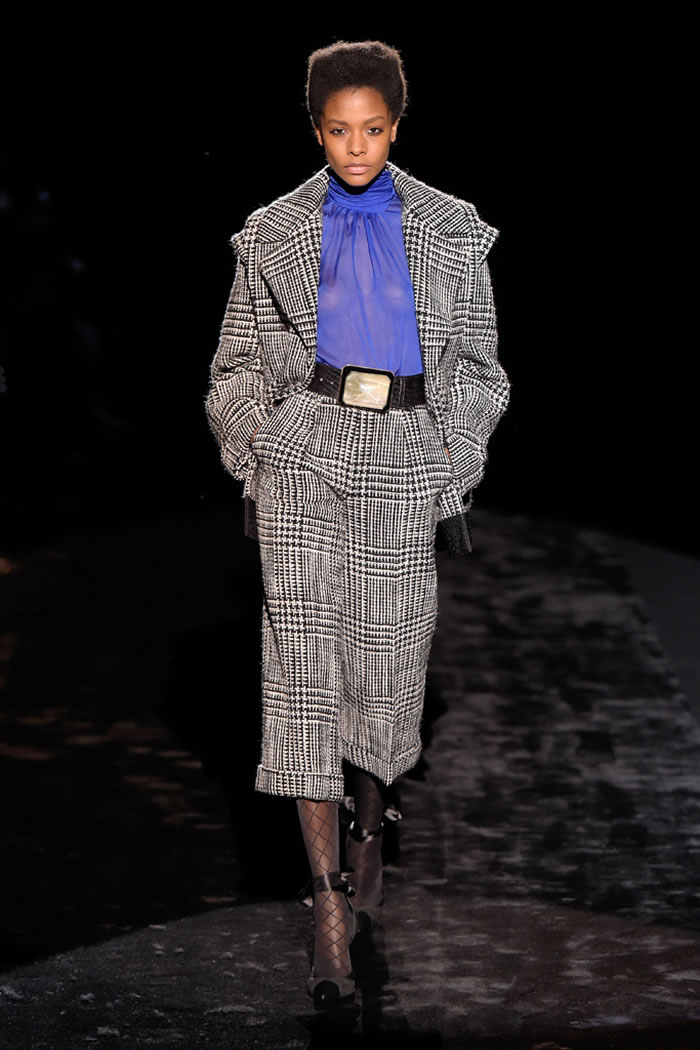 The designer seems to be in a commercial state of mind, bypassing the collection’s Eighties and Art Deco references on the mood board to talk about a wardrobe of “easy-to-wear” pieces. Indeed, padded blousons, sweaters with silk sleeves and black lace sheath dresses are among the items hip girls will go for. Culottes and enveloping coats in bold Prince of Wales checks were less convincing.