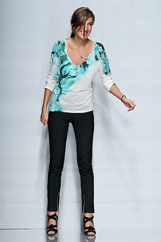 After officially parting ways with Giles Deacon just weeks ago, the house of Ungaro is clearly attempting a new tack, going the route of Balmain and, for a couple of seasons, Dior, by appointing an unknown designer from within in place of a star. Still, today’s collection, at least going by its awkwardly worded show notes, was "the result of conscientious teamwork." And in its very commercially slanted pragmatism, it had the feel of design by committee—though certainly not an untalented one. The collection ably touched on all the house’s codes of sexy, cowled, and ruched jersey dresses, and soft tapered silk pants and jumpsuits in splashy prints, these inspired by NASA aerial images that looked like abstract florals. There were ruffles on peplumed jackets and tiered skirts.