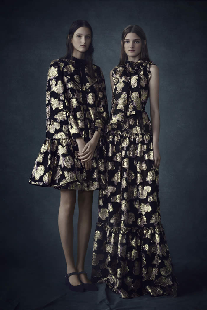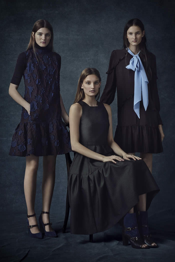 Erdem Moralioglu’s pre-fall lineup was luxurious, romantic and dark, with hints of old-school charm worked in a modern way. Intrigued by the idea of a portrait artist and his or her subject, Moralioglu played with “the idea of formality and informality,” with inspiration coming from portraits by Lord Snowdon and John Singer Sargent. The result was a collection of dresses with high ruffled necklines, lace collars and modest lengths. Bows rested at the neckline or were tied neatly on sleeves.