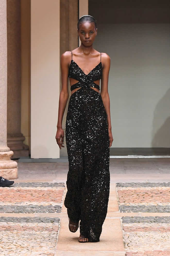 Sequins were out and proud, too — shimmering green on the surface of a shirtdress, or winking from a lineup of long black dresses, skirts, and halter tops.