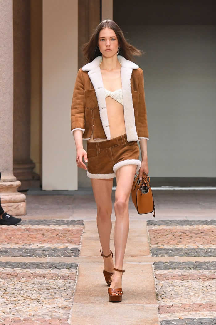 All that whimsy was balanced by an unusual amount of sporty — borderline street — attire, including anoraks in bright pink or green, slim cargo pants that gathered just below the knee, and a suit made from shearling shorts and a little matching jacket.