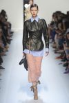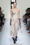 One, in a watery green duchess satin, was adorned with faded pink lace embroidery like the smudgy pastels of an Jean Antoine Watteau painting. Others were fashioned from scalloped tiers of faded red or sparkling gold lace, and had a flapper-like feel to them, while white silk ones had lace inserts and pleated or ruffled skirts. The latter were layered under guipure lace coats or curving, hourglass trenches.