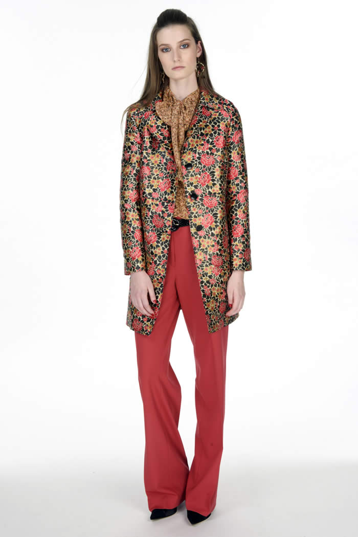 Veronica Etro’s arty approach to pre-fall combined “bold Matisse florals and soft graphics.” Her mix-and-match style yielded elegant, feminine looks including a patchwork silk crepe de chine shirt worn with a flared midiskirt in lightweight wool. Flowers abounded, interwoven with a signature house paisley on a silk Georgette gown with a plunging V-neck and a sequined grosgrain detail at the waist, and worked into an exquisite intarsia on a cashmere and cotton sweater.