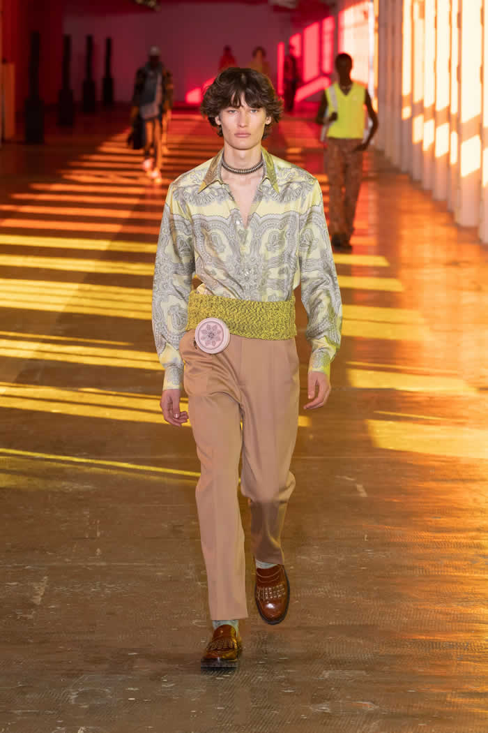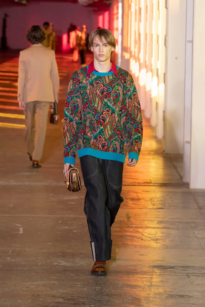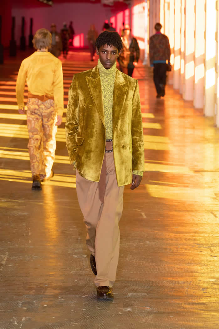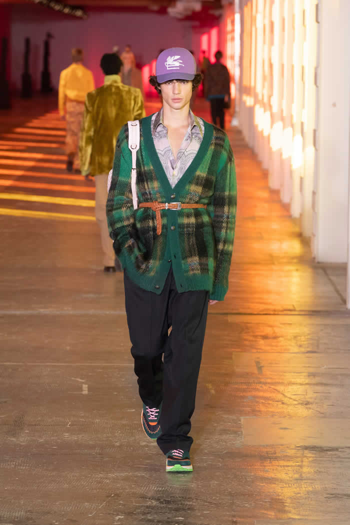 Kean was wearing a green coat recently dug out from some distant corner of his archive that dated back to a 1996 Etro collection titled Tower of Babel, one of his earliest. His remembered archive played a part here, too, in embellished ghillie loafers and pastel cricket sweaters and other bits and bobs he recalled wearing as a schoolboy in Cambridge.