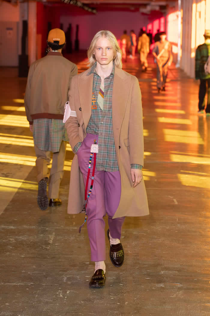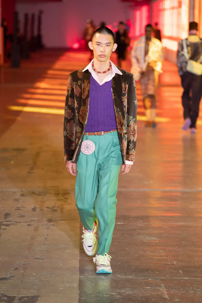 The weight of references and remembrances made for looks that were sometimes densely layered—green upcycled shirting under a cagoule under a knit cummerbund under a paisley piped suit in Japanese woven houndstooth under a shoulder-robed cashmere coat—and sometimes powerfully competitive: leopard print pants in combat with a matchy-matchy paisley shirt and sweater.