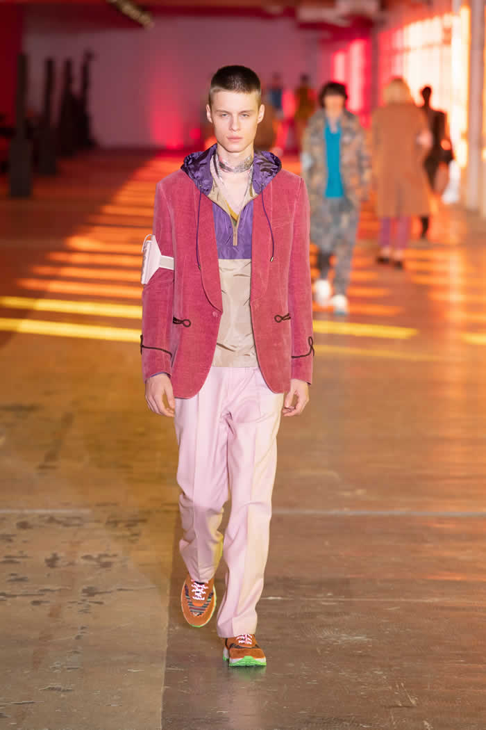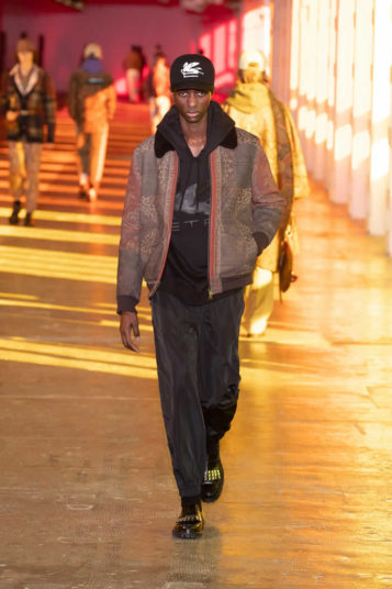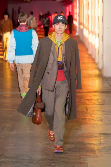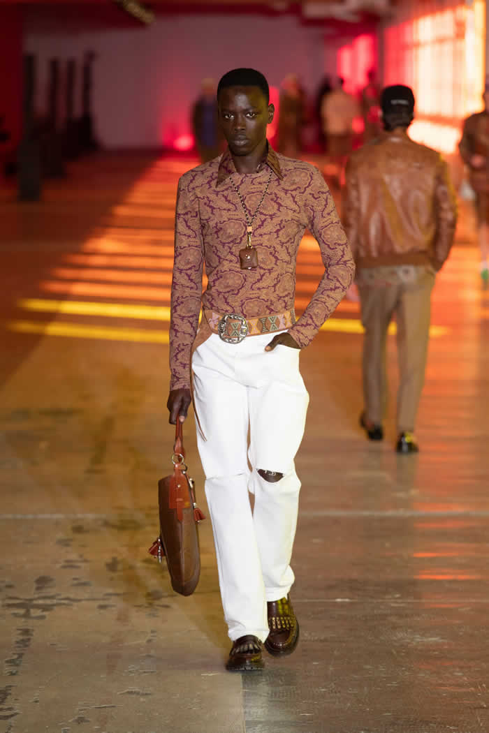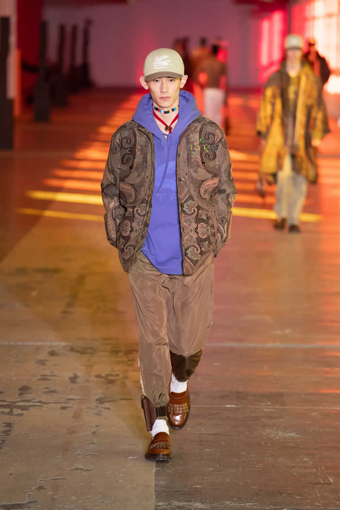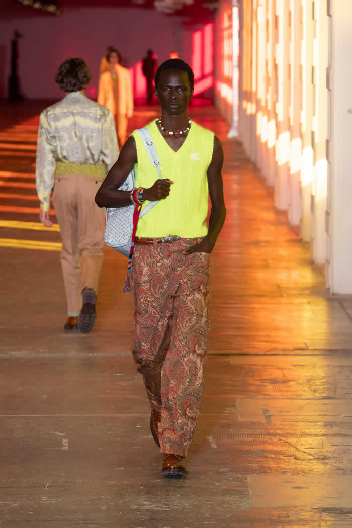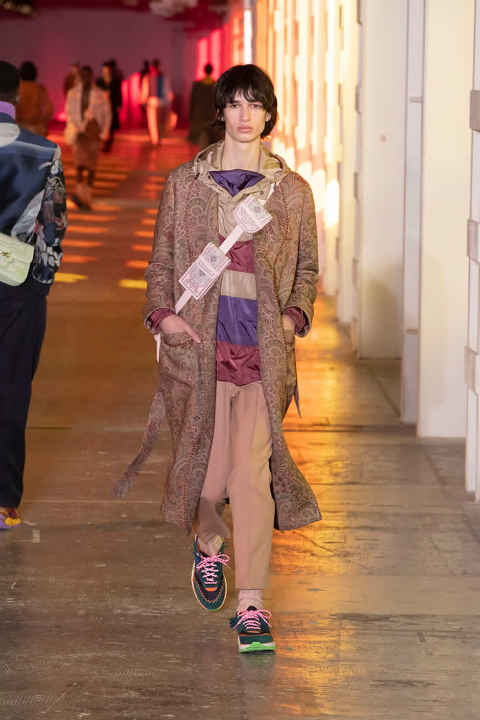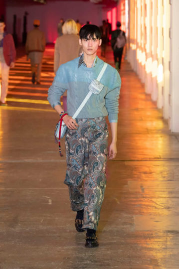 Etro extended the studiedly shambolic range of source material from menswear to homewear via quilted paisley outerwear and ponchos in tapestry jacquards. He buttressed his looks with velcro-secured bandoliers of printed leather personal luggage. Punchy “vitamin colors” accented fetching weave-detail sneakers, cable-knit sweater vests and those hand-knit cummerbunds to add beetroot, lime or blueberry jolts to Etro’s multiple-ingredient wearable smoothies.