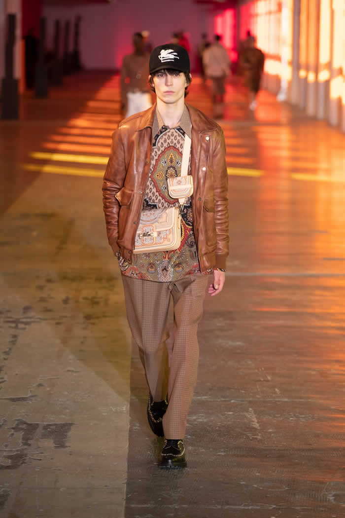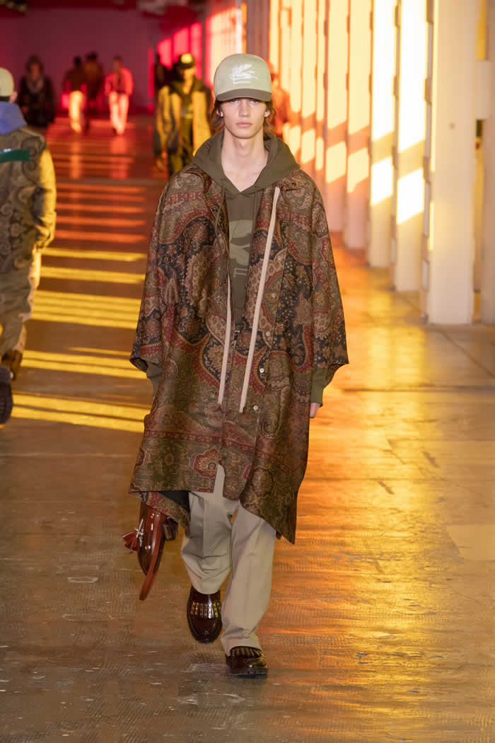 Etro extended the studiedly shambolic range of source material from menswear to homewear via quilted paisley outerwear and ponchos in tapestry jacquards. He buttressed his looks with velcro-secured bandoliers of printed leather personal luggage. Punchy “vitamin colors” accented fetching weave-detail sneakers, cable-knit sweater vests and those hand-knit cummerbunds to add beetroot, lime or blueberry jolts to Etro’s multiple-ingredient wearable smoothies.