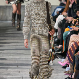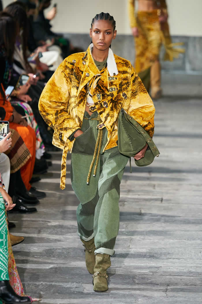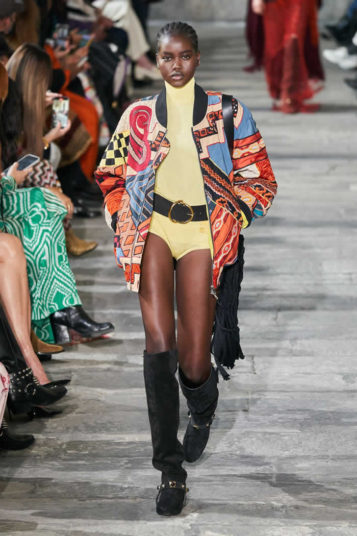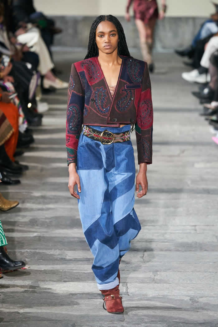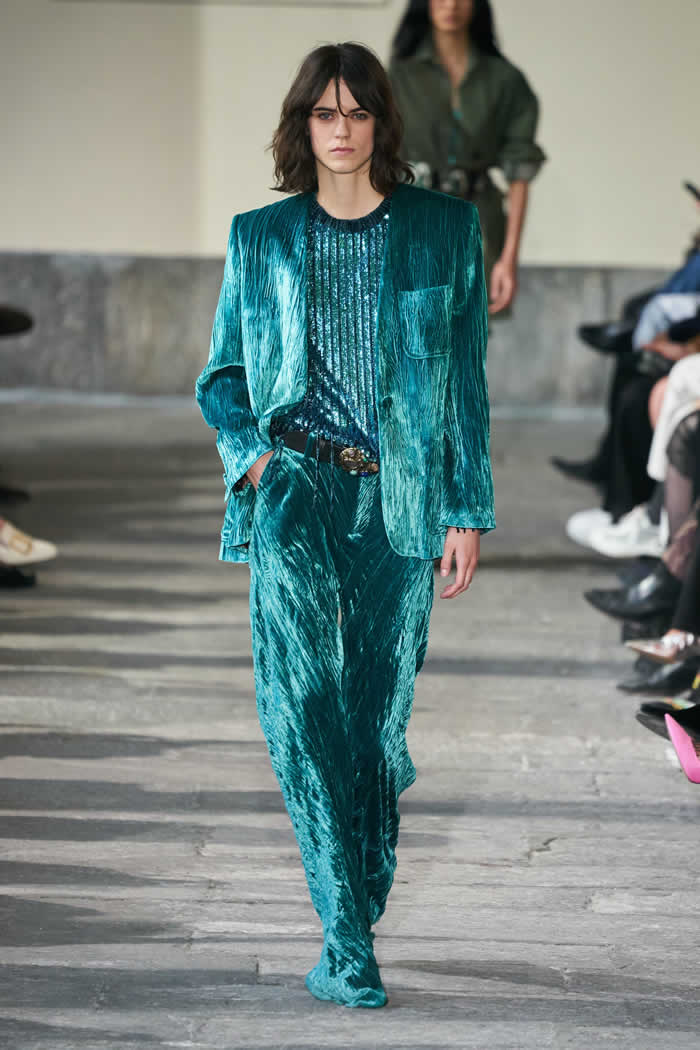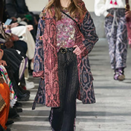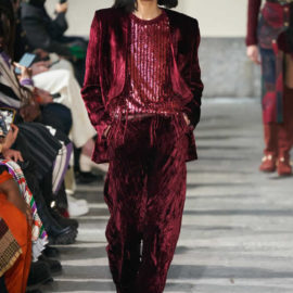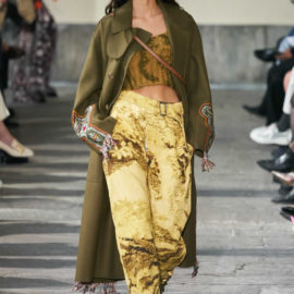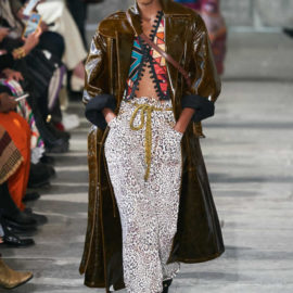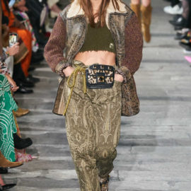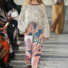 This time she traveled through boho, arty-crafty knitwear to ’80s puffy-silhouetted patchwork bomber jackets to end up with suave, ’70s crushed-velvet trouser suits and slinky bias-cut black satin dresses. The paisley registered in various graphic forms—super enlarged (as the designer had described) to look like an animal-print lining on a shearling aviator jacket, or deconstructed down to its “harlequin” elements, stamped in repeat on a vibrant pink velvet jacket and a semi sheer, diaphanous chiffon dress.