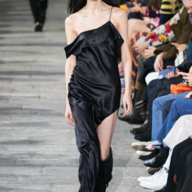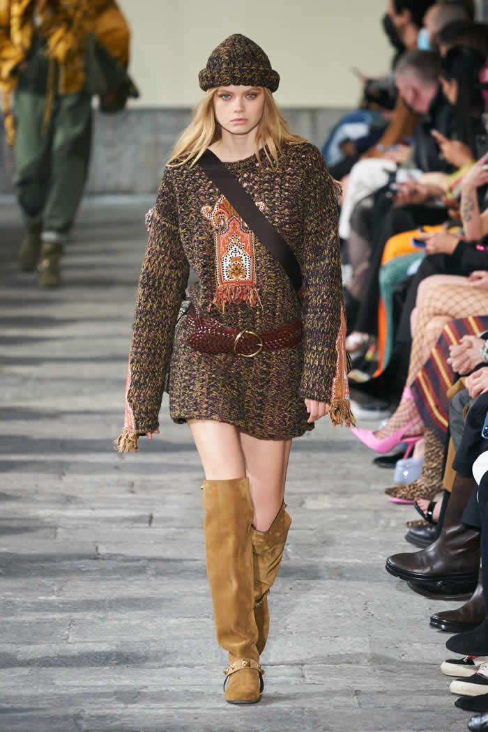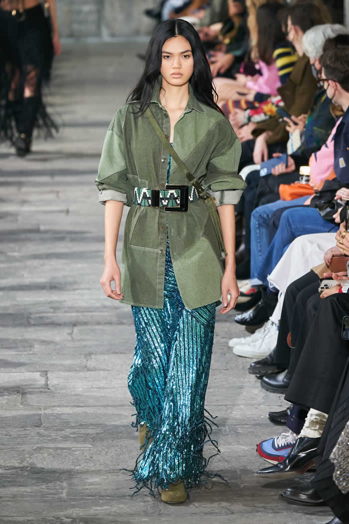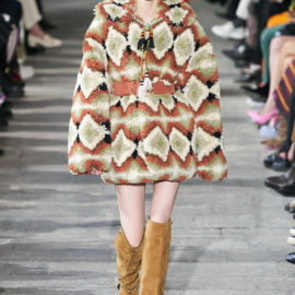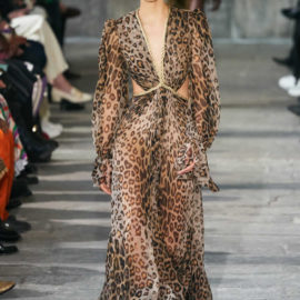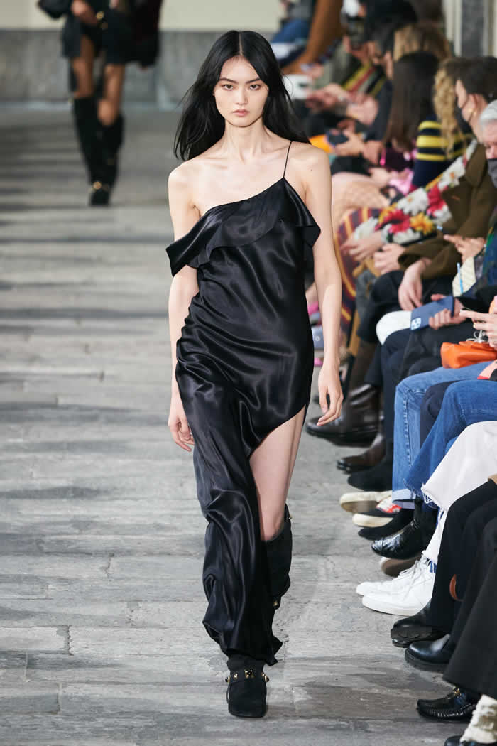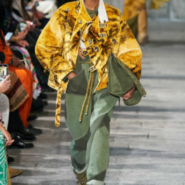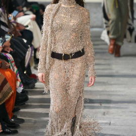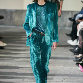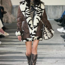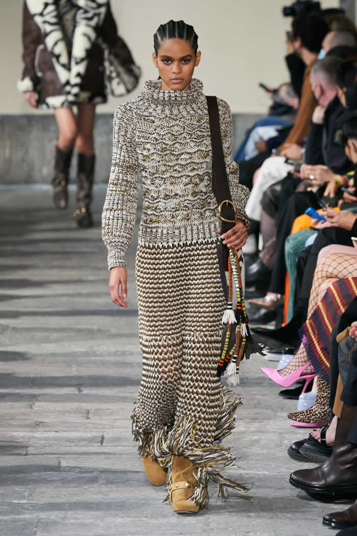 This time she traveled through boho, arty-crafty knitwear to ’80s puffy-silhouetted patchwork bomber jackets to end up with suave, ’70s crushed-velvet trouser suits and slinky bias-cut black satin dresses. The paisley registered in various graphic forms—super enlarged (as the designer had described) to look like an animal-print lining on a shearling aviator jacket, or deconstructed down to its “harlequin” elements, stamped in repeat on a vibrant pink velvet jacket and a semi sheer, diaphanous chiffon dress.