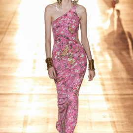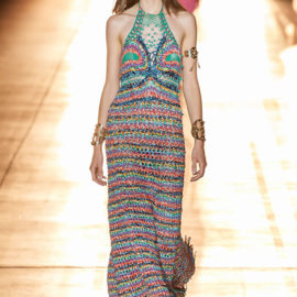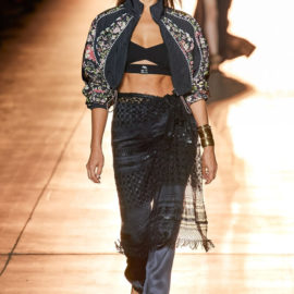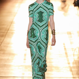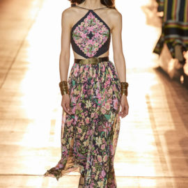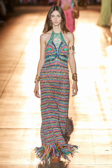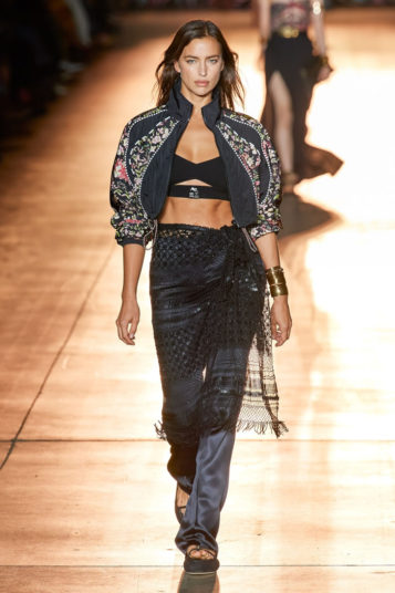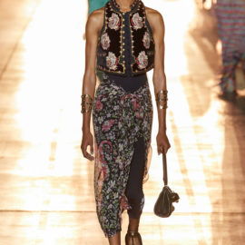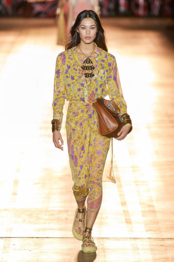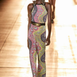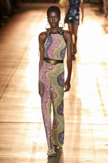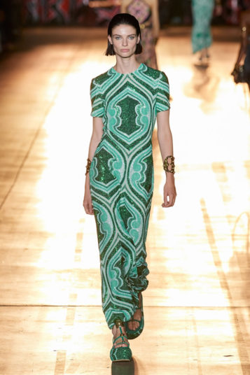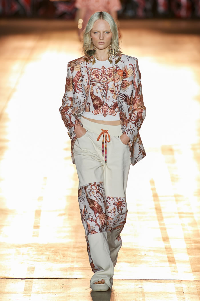 She then took this house-relevant source spirit and renewed it afresh through a design expression filtered through those 1990s Shoreditch nights. So to a soundtrack that sandwiched Massive Attack between Moby, we saw Etro-signature paisleys blended with flower-power florals, mandala embroideries, and tree of life graphics, all punctuated by fertility-symbolizing Zoroastrian seed motifs.