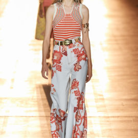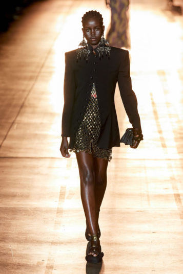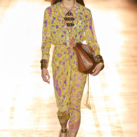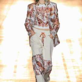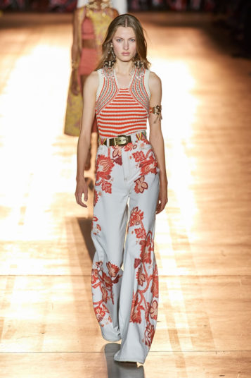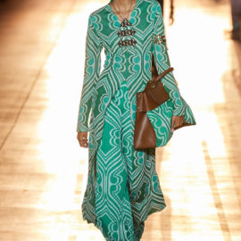 As you’d expect at Etro, this decoration was applied to looks including tailoring, kicky denim, and floaty Talitha Getty–ready chiffon dresses. Veronica also, however, pressed fast-forward on the silhouette time machine to introduce a swathe of looks you could totally imagine Björk wearing while dancing on the back of a truck.