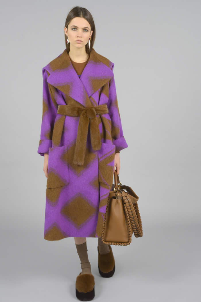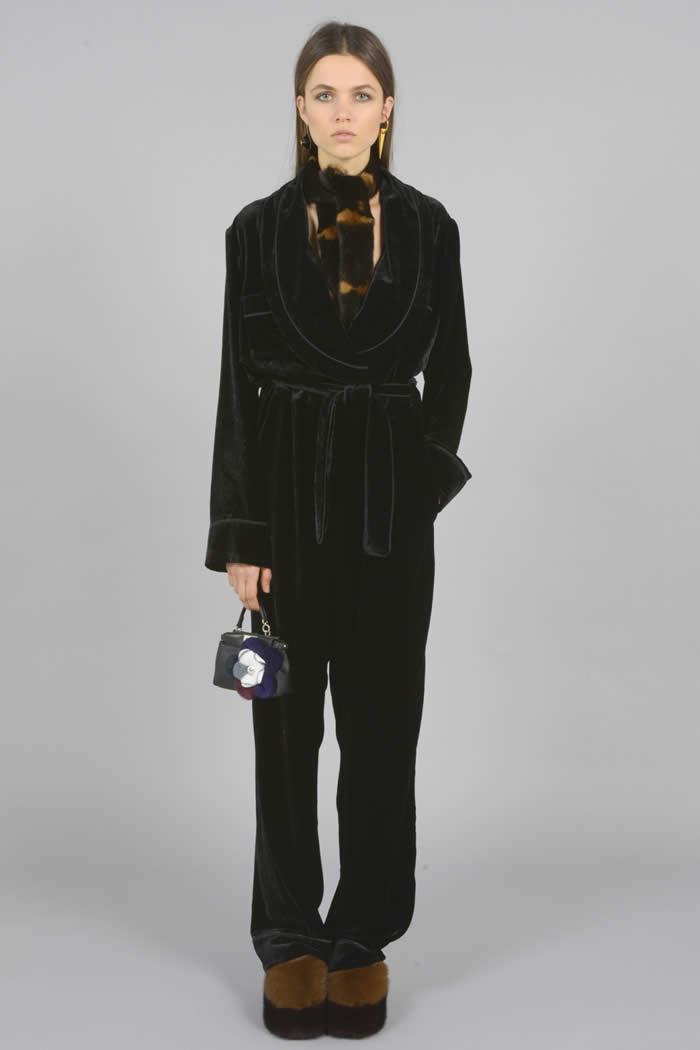 Chunky slippers in leather, sheepskin and fur worn with slouchy socks underscored the loungy boudoir feeling of the clothes, including a velvet pajama-like tuxedo and a roomy, fuchsia and brown wool jacquard robe coat cinched with a lavish mink belt. Another delightfully rich graphic piece was a mannish intarsia coat crafted from mink – shaved and long haired – with astrakhan lapels.