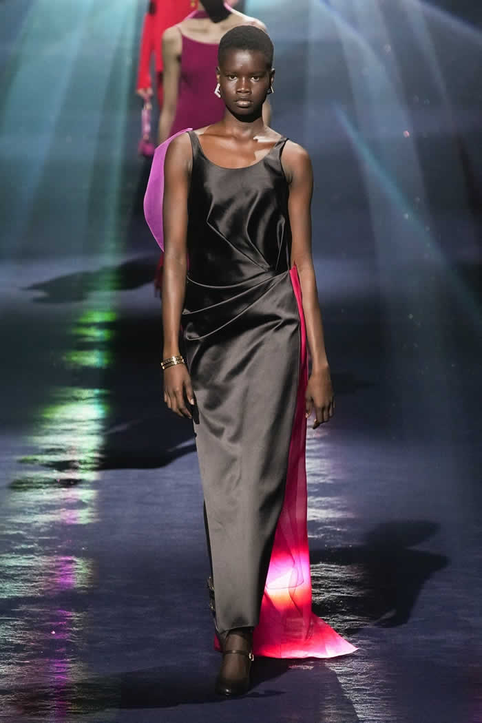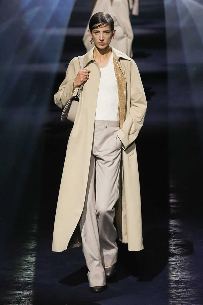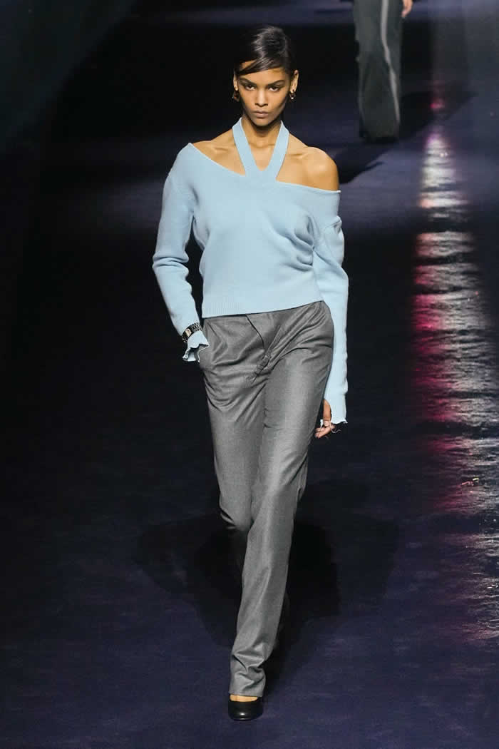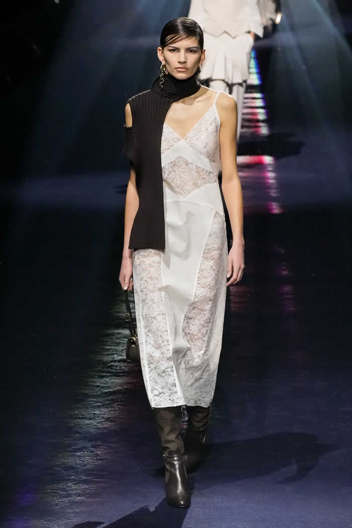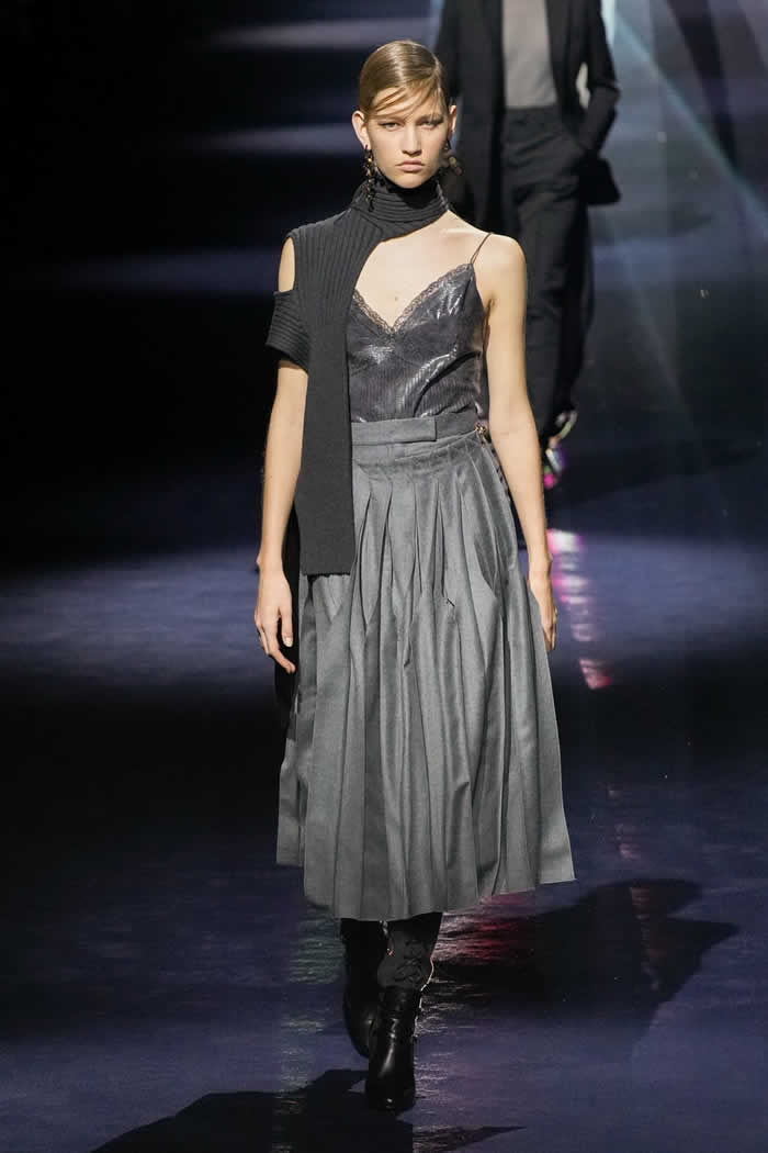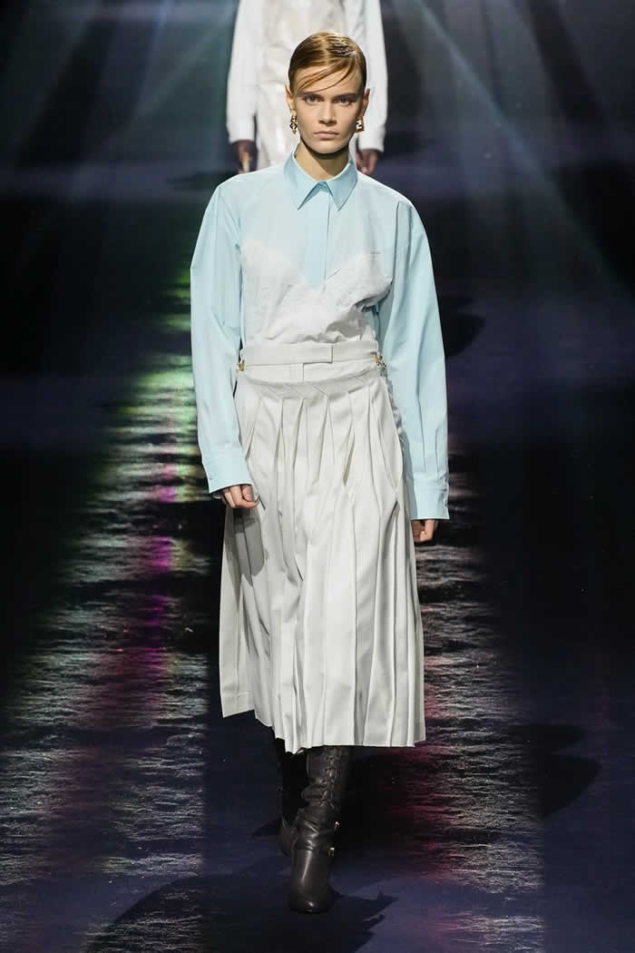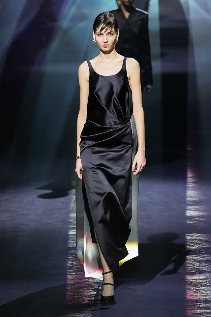 Thus two menswear-style mackintoshes came lined with pale yellow sequins, a detail whose fabrication was adapted from the atelier. Other couture-origin details included the pressed lingerie applied to cotton shirting or worn as a mid-layer. The closing capes on draped satin dresses were another haute note.