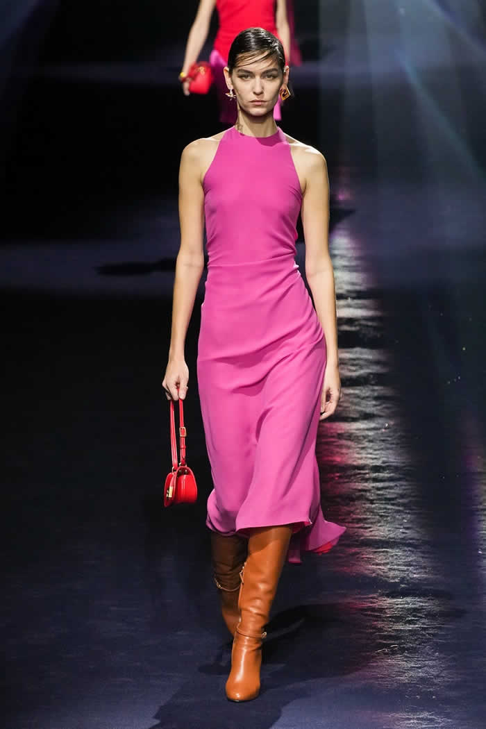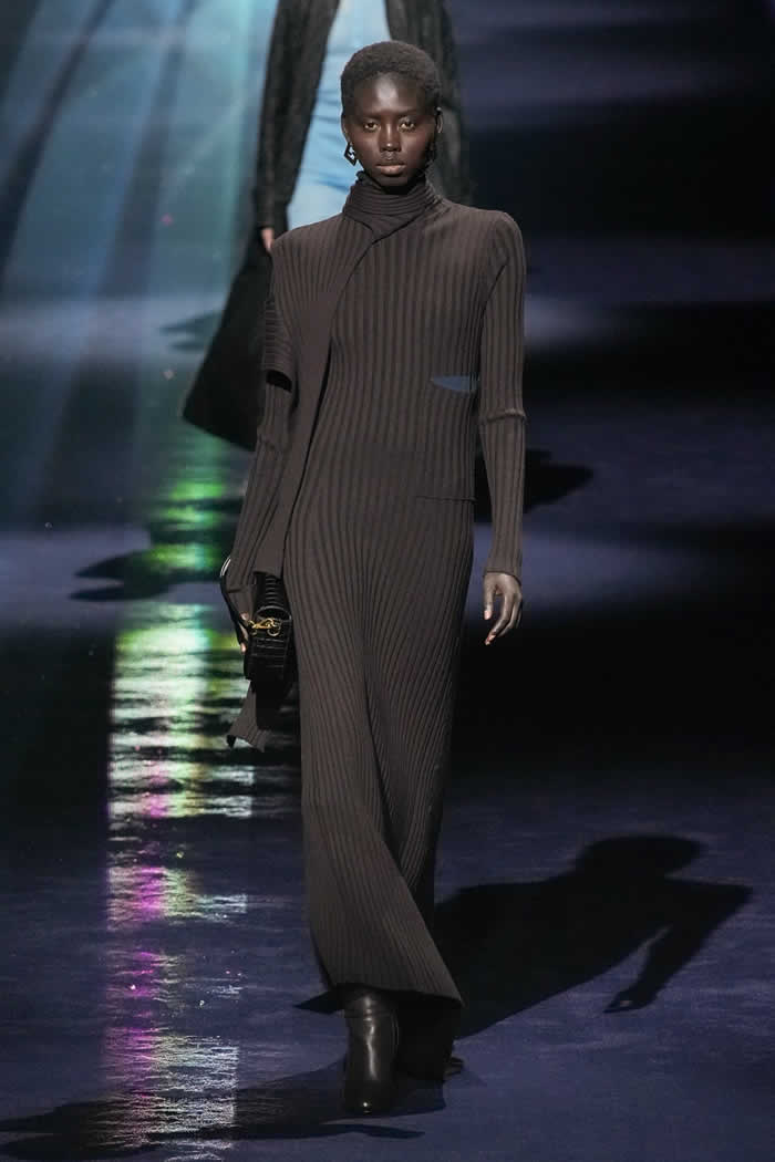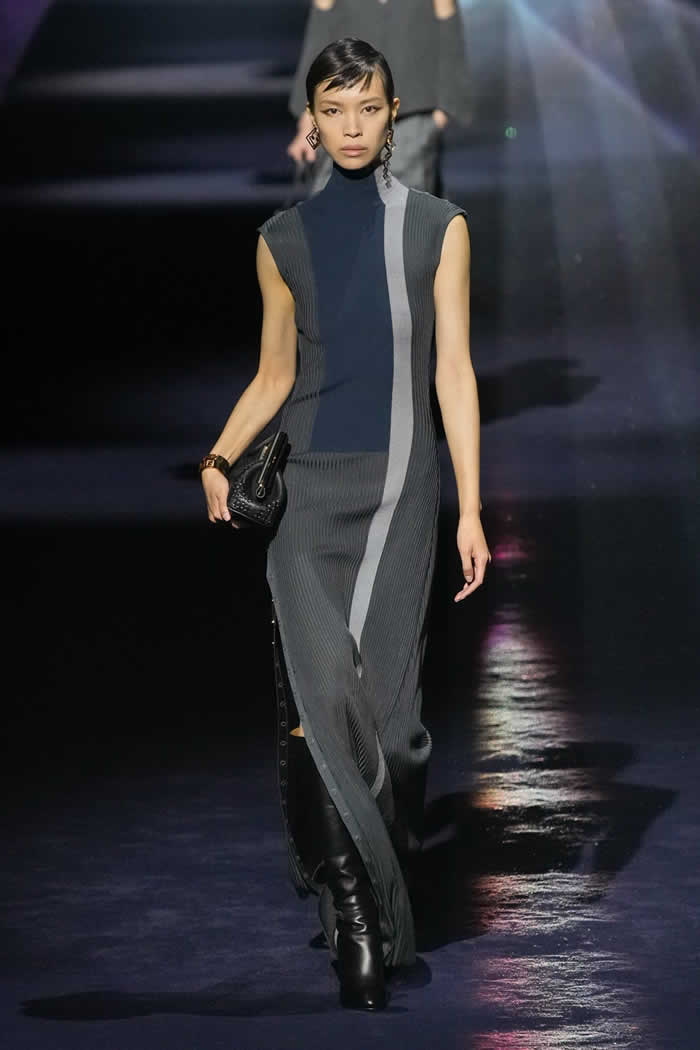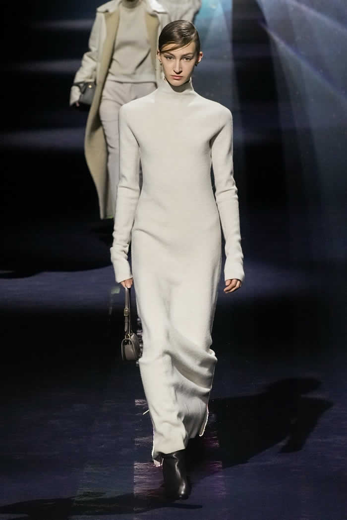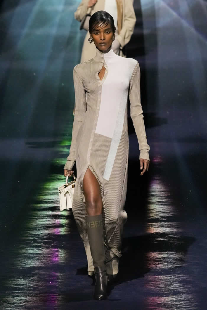 One last key protagonist in the Fendi story also made a subtle cameo. The triple-yarned, ribbed knits that impressed graphic blocks of color on a clinging, popper-secured silhouette were drawn from Karl Lagerfeld’s fall 1996 collection for the house. Said Jones: “It’s about real dressing: that Italian sophisticated woman who you know, that becomes global.”