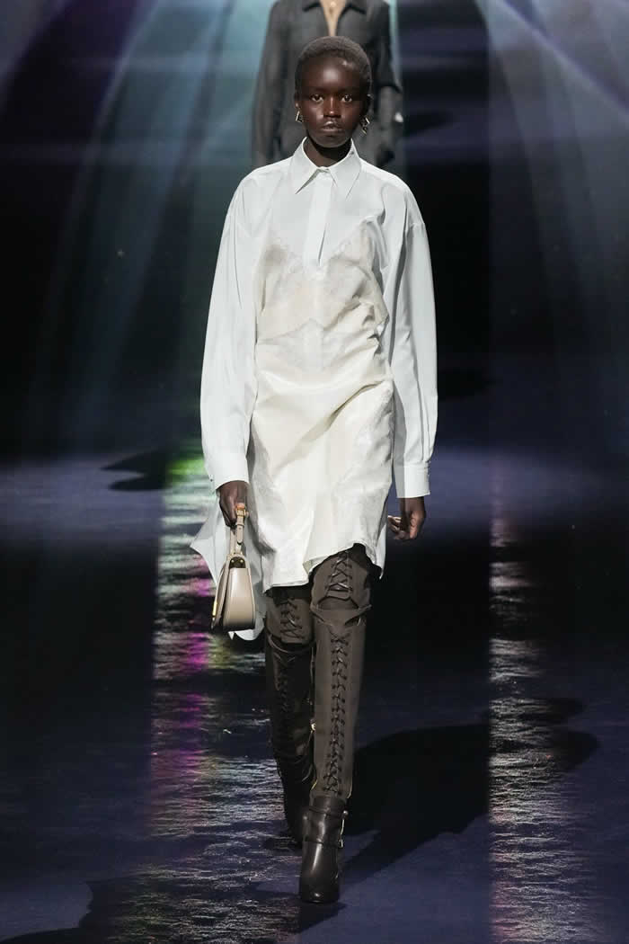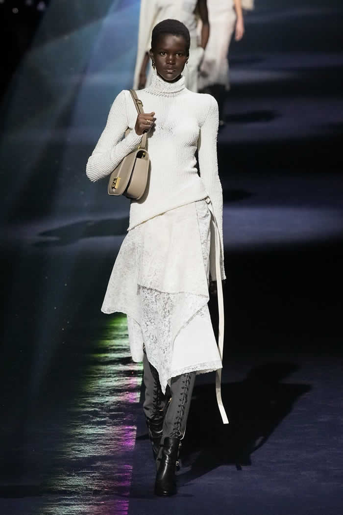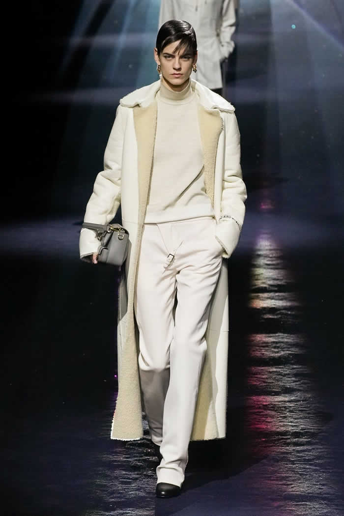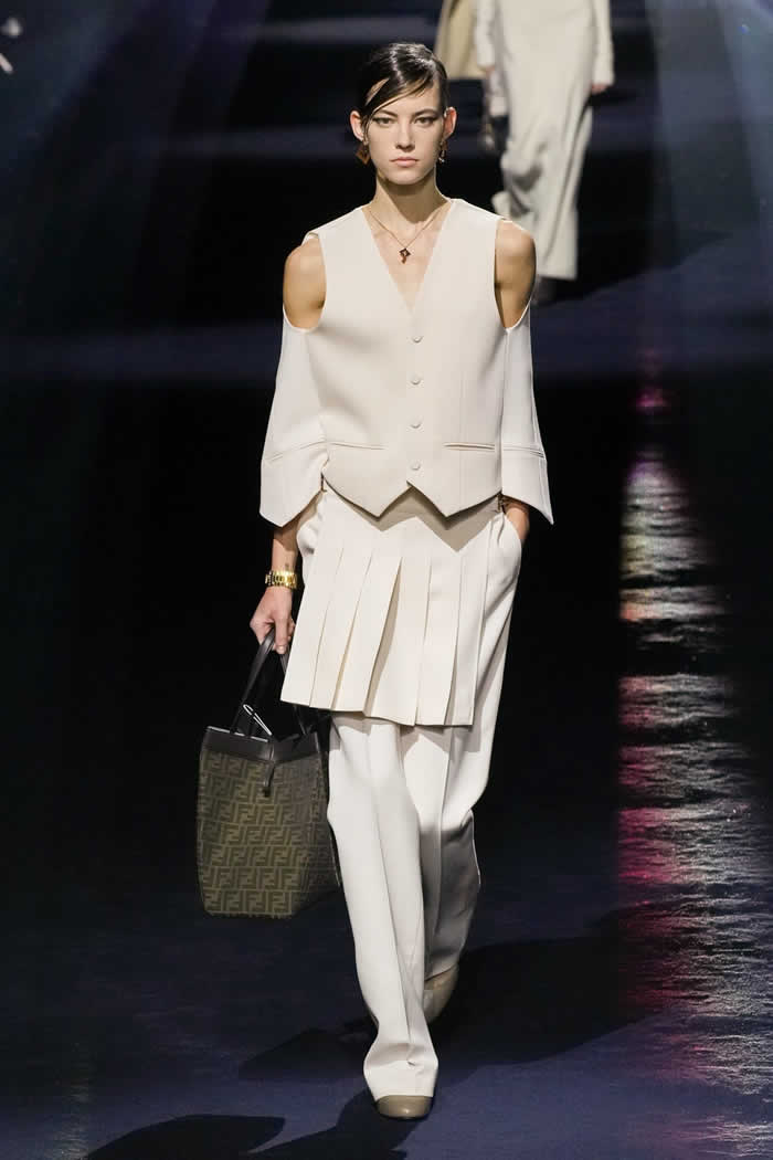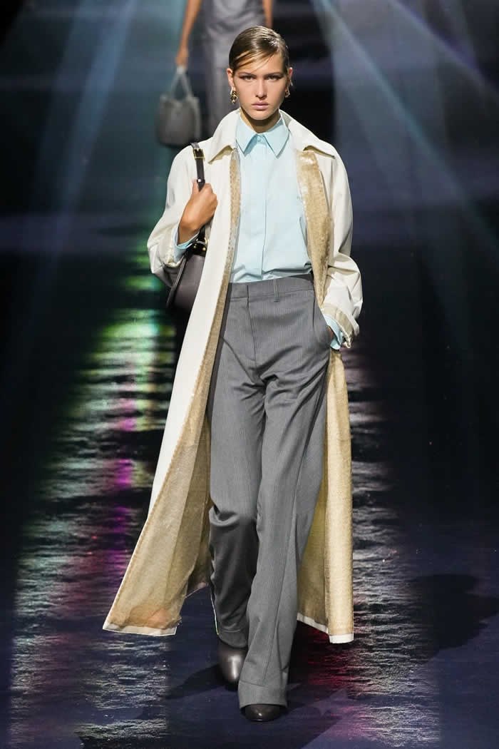 Silvia’s summation was as deftly succinct and effective as that bag’s flick-of-the-fingers, no-fuss transformational operation. Today Jones worked to combine four finely-observed elements in order to fashion a collection that felt both inherently Fendi and simultaneously fresh. The first stemmed from his own instinct to incorporate menswear fabrics and shapes into the vocabulary of sophisticatedly feminine dressing.