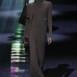 One last key protagonist in the Fendi story also made a subtle cameo. The triple-yarned, ribbed knits that impressed graphic blocks of color on a clinging, popper-secured silhouette were drawn from Karl Lagerfeld’s fall 1996 collection for the house. Said Jones: “It’s about real dressing: that Italian sophisticated woman who you know, that becomes global.”