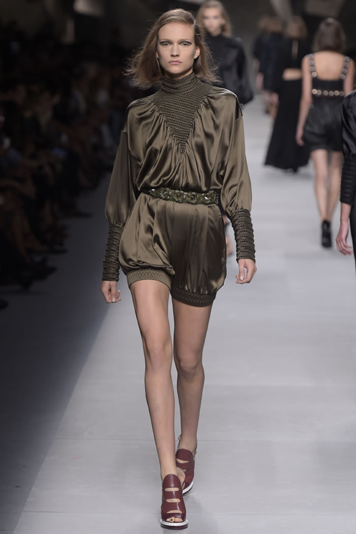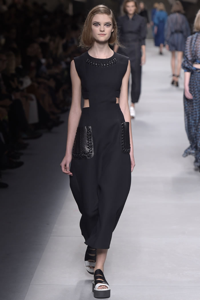 Silhouettes were diverse: rompers with balloon pants of courtly proportions; full-skirted dress-over-blouse combos that worked a milkmaid attitude; short, A-line looks with a crusader vibe. At a time when intricate surface decoration is everywhere, Lagerfeld shifted into reverse, preferring strong details that swung earthy rather than precious. Macro-stitched leather and cording outlined coats and held brazen external pockets in place while smocking (or so it looked from the runway) gripped wrists and waists of the lineup’s more fluid looks. At times Lagerfeld opted to subtract rather than add, slicing circular strips from the waists of coats and dresses for graphic impact.