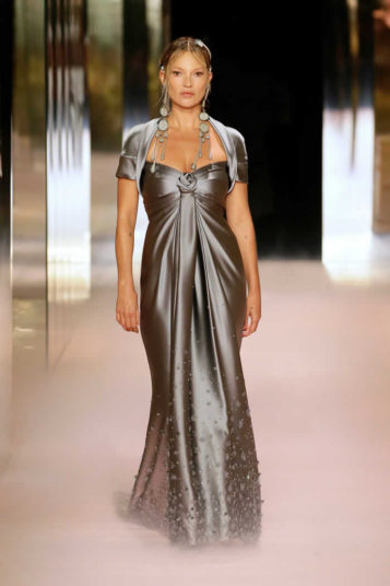 Leonetta Fendi and jewelry designer Delfina Delettrez, whom Jones has now named as creative director of jewelry at the LVMH-owned brand. Delettrez’s supersized chandelier earrings graced evening gowns with a 1930s Vionnet silhouette, a certain slinkiness that resonated in Moore’s slithery silk suit, which was dying to morph into a dress.