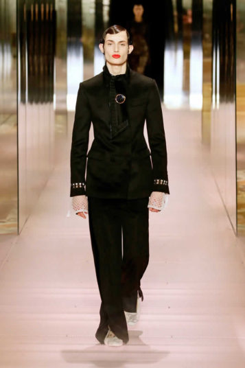 Other tailoring felt more rigidly structured for male anatomy, framed by floor-sweeping kingly capes. At times, forms grew shapeless, like a blush pink look of highly textured layers topped off with a lace coat webbed from roses or a mound of marbled garments draped over Naomi Campbell. Jones’s juxtapositions culminated in split-personality dresses hybridized from half an evening gown and half a blazer or shirt. They had an air of upholstery about them, perhaps a nod to Charleston.