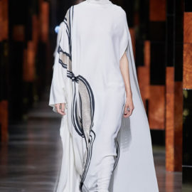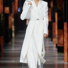 The models glided out from a newly-configured backstage—where the vibe was light but Covid-19 regulations strictly observed—down a runway whose arches echoed the house’s Roman home, the Palazzo della Civiltà.