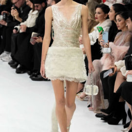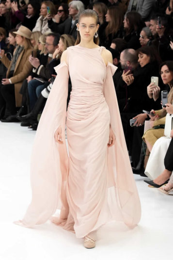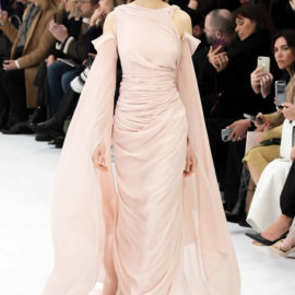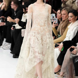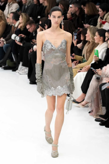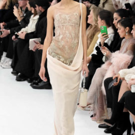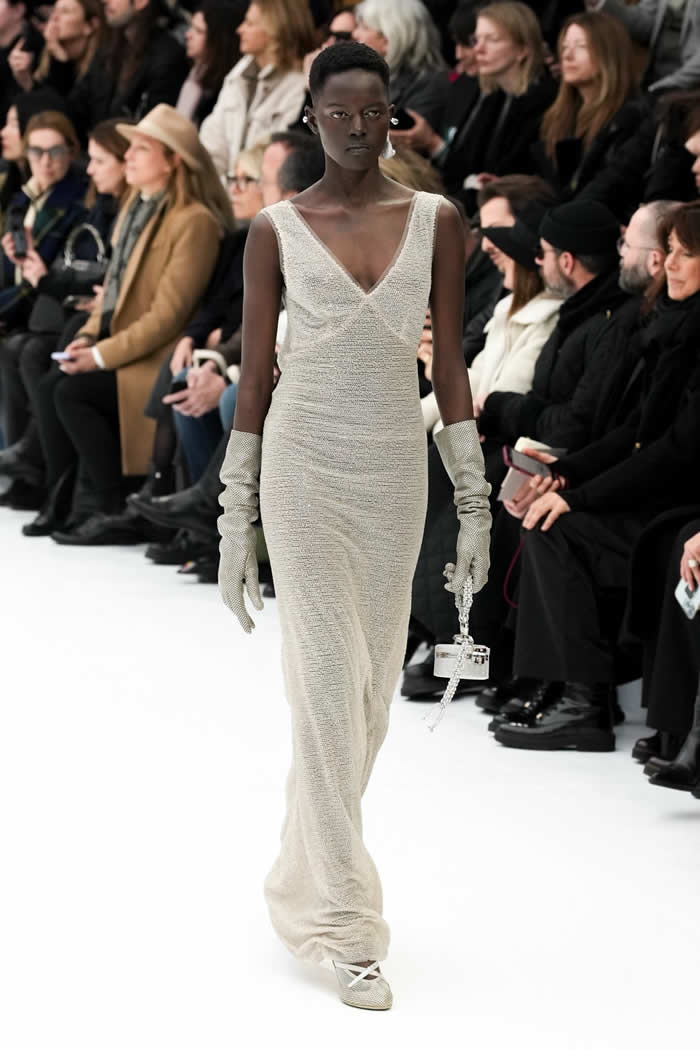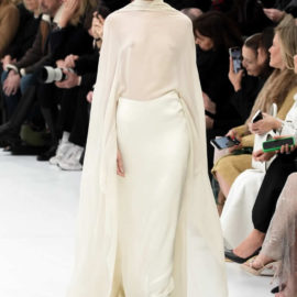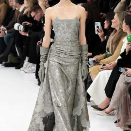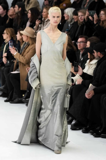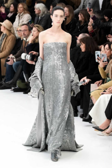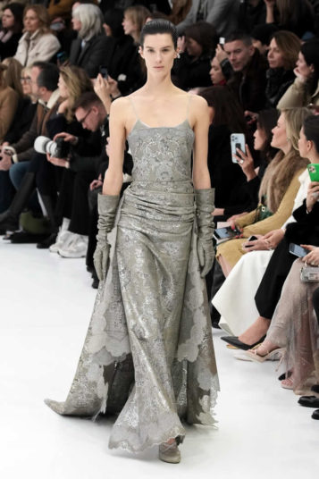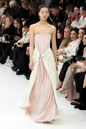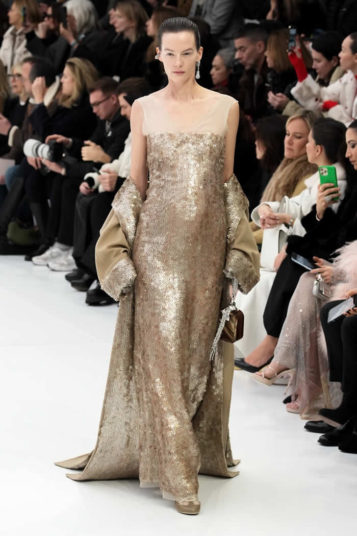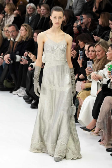 With little variation in silhouette and predominantly pale colors, this fashion show didn’t set off many sparks. The craft of couture was the star, perhaps exemplified by the metallic leather made to resemble lace or chain mail while maintaining malleability and softness.
