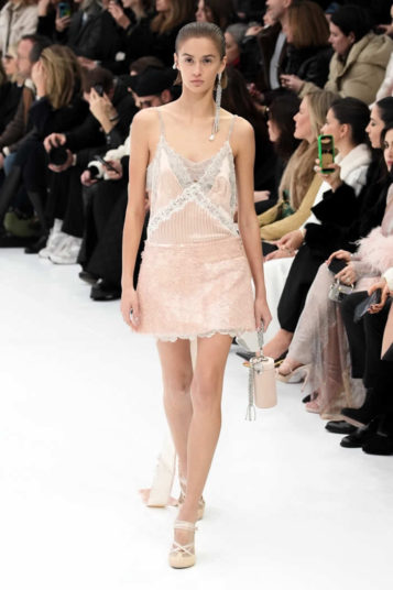 Perhaps. But Fendi’s workmanship is so delicate and painstaking that having bright light, the models nearly brushing the knees of those in the front row, and no busy decor competing for attention heightened appreciation for laser-cut leather, dense micro-beading, gossamer crochet, micro pleating, and intricate lace.