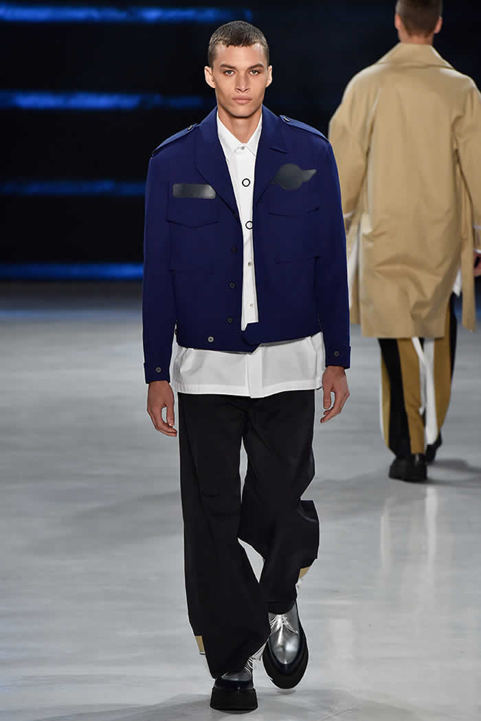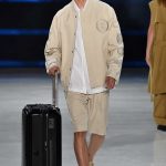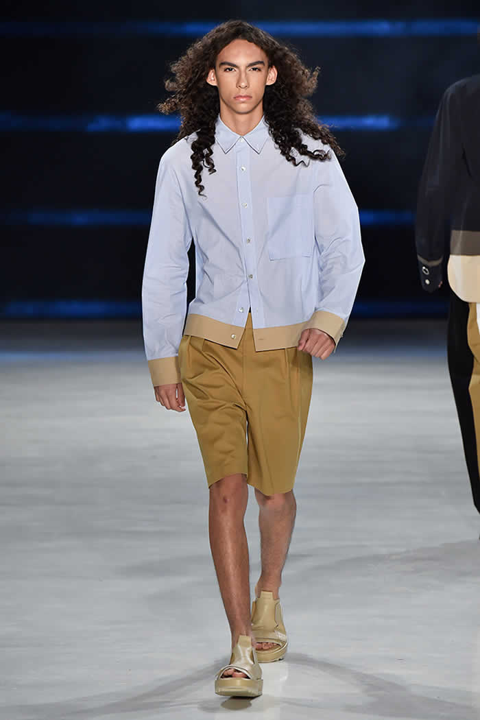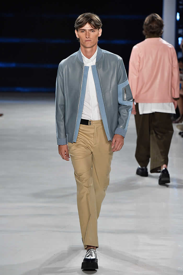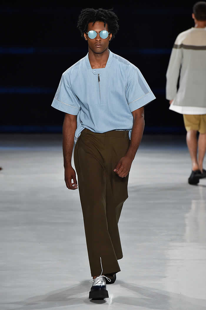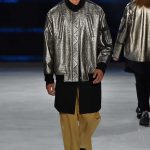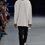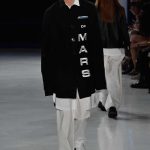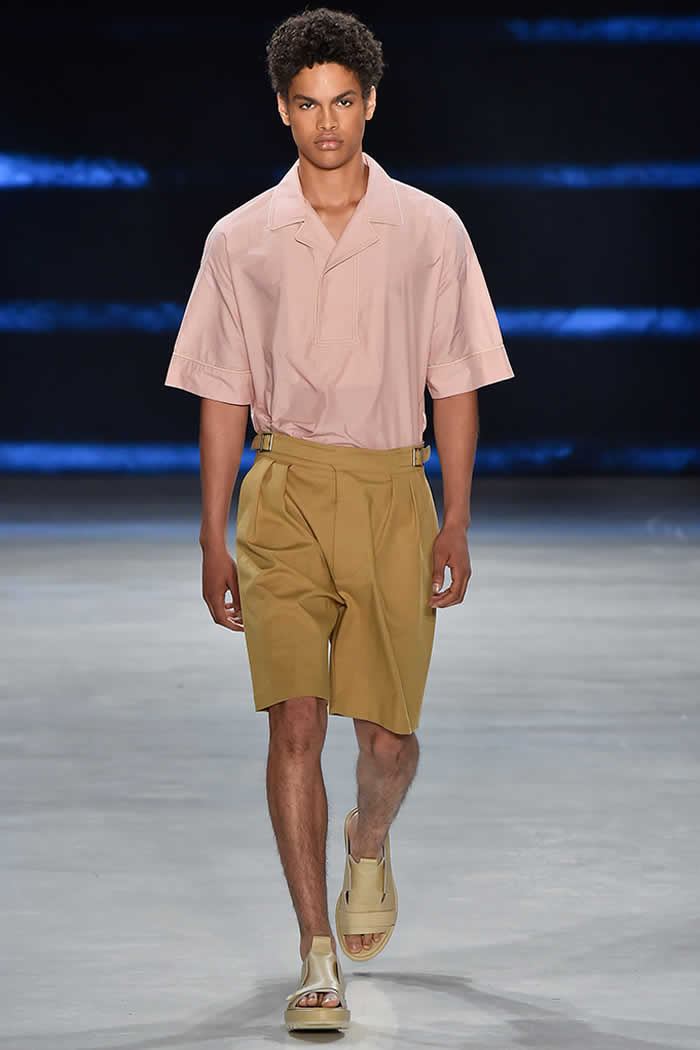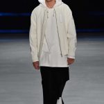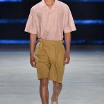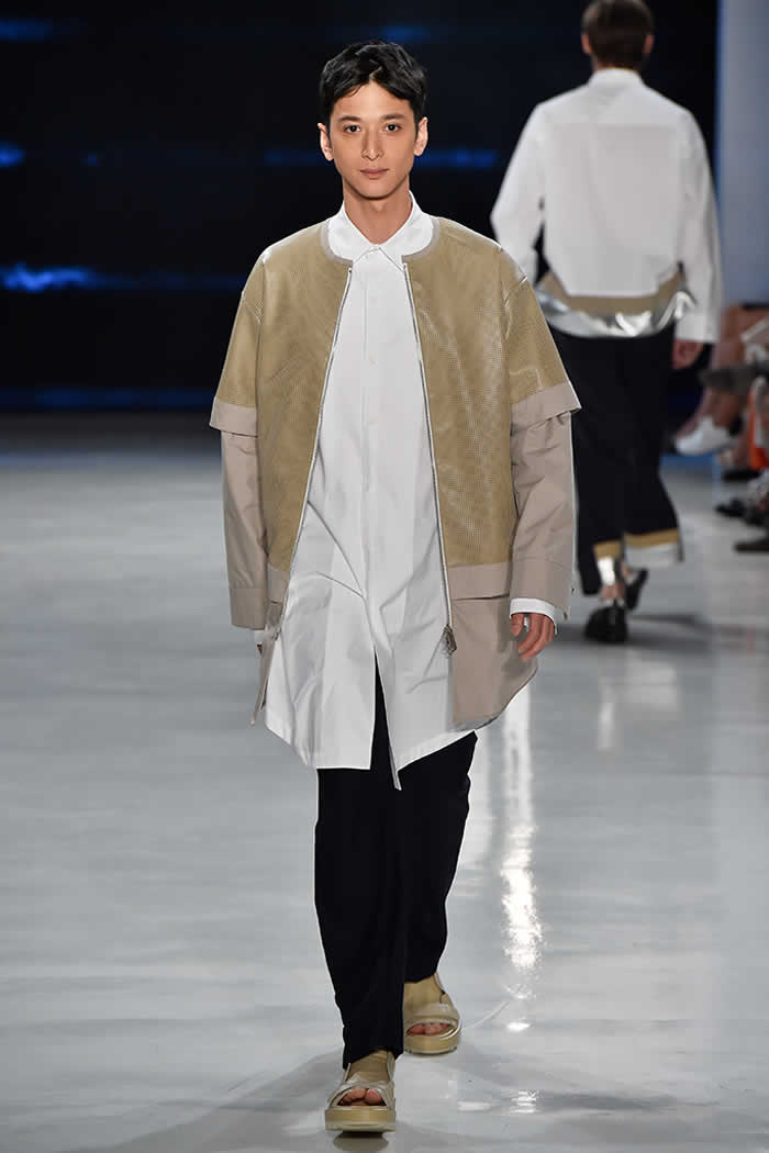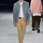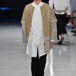 General Idea lightened things up this season, but the brand’s propensity for playing with proportions continued. Designer Bumsuk Choi presented a lineup of elongated shirts and oversized outerwear and flight suits. But he moved away from the dark palette that is a hallmark of the brand, switching it up with tempered hues of beige, pink and aqua-green. Highlights included a metallic oversized bomber with a long black button-down paired with chino khakis, and a nylon black patch-pocket flight suit. The collection felt more wearable as Choi moved toward a more colorful future.