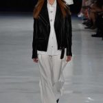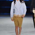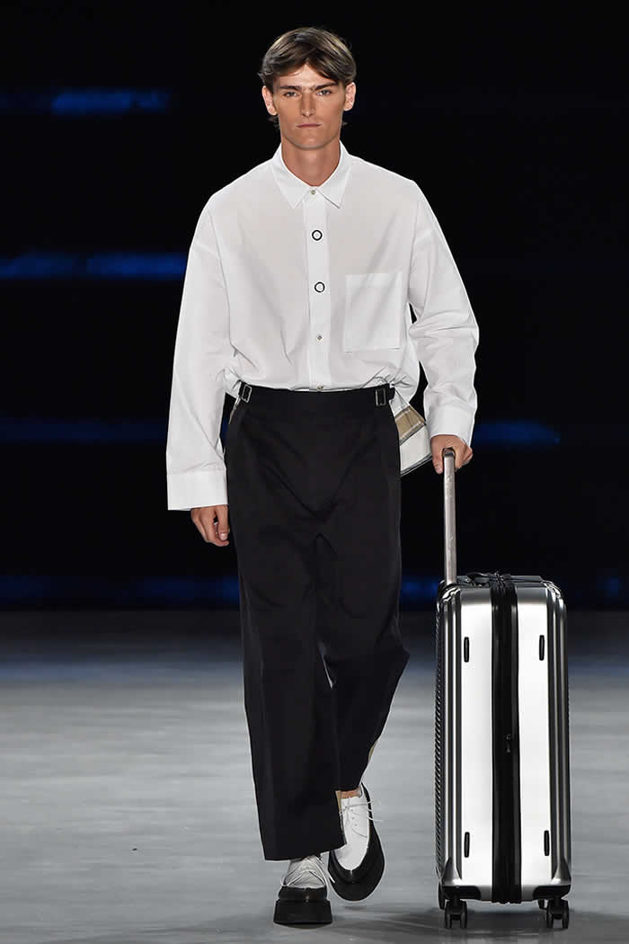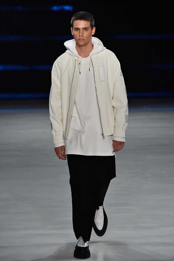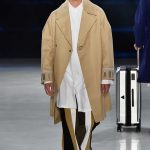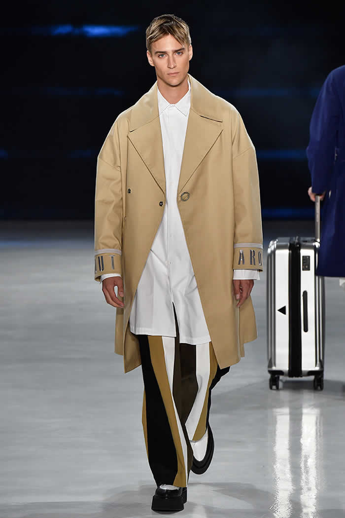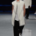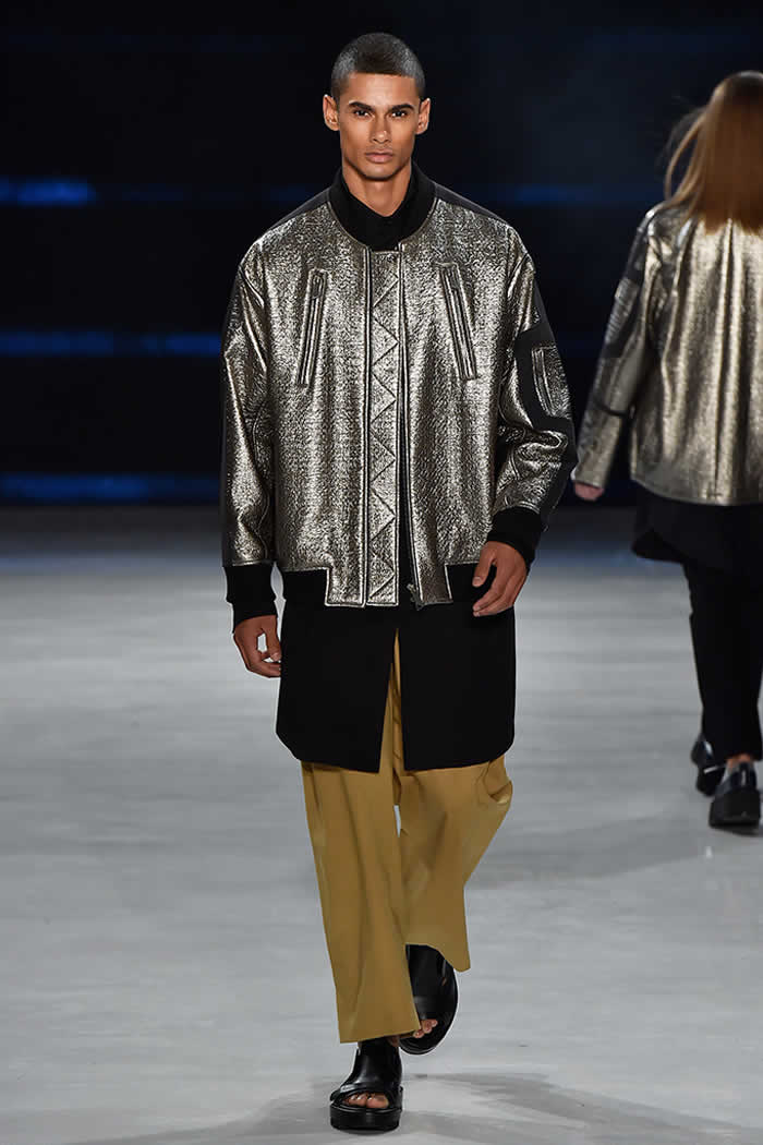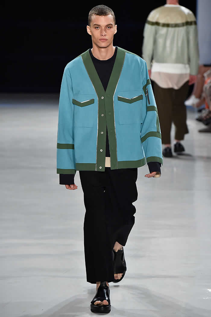 General Idea lightened things up this season, but the brand’s propensity for playing with proportions continued. Designer Bumsuk Choi presented a lineup of elongated shirts and oversized outerwear and flight suits. But he moved away from the dark palette that is a hallmark of the brand, switching it up with tempered hues of beige, pink and aqua-green. Highlights included a metallic oversized bomber with a long black button-down paired with chino khakis, and a nylon black patch-pocket flight suit. The collection felt more wearable as Choi moved toward a more colorful future.