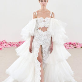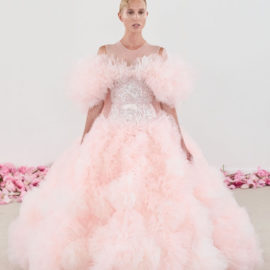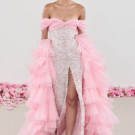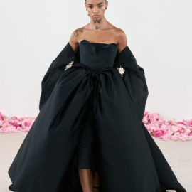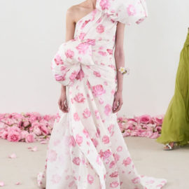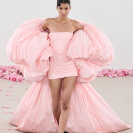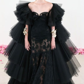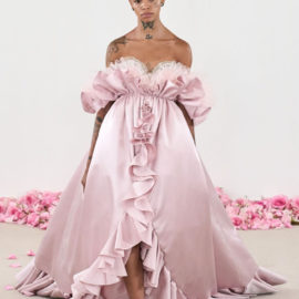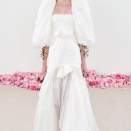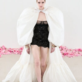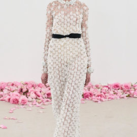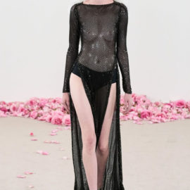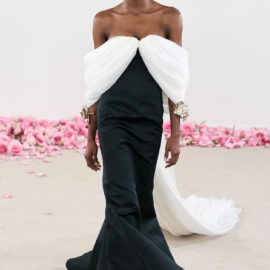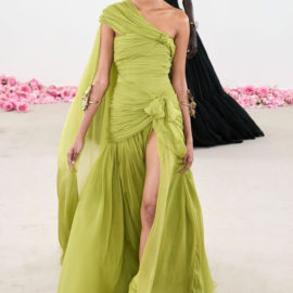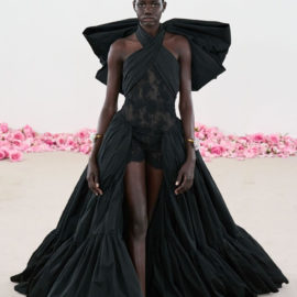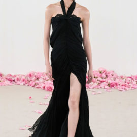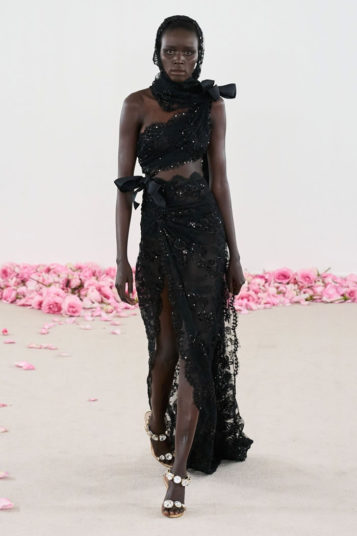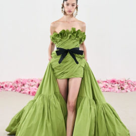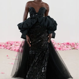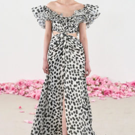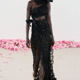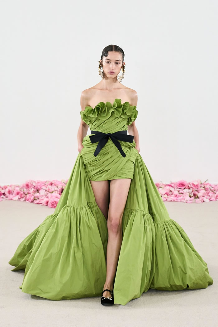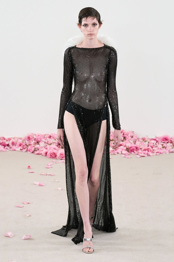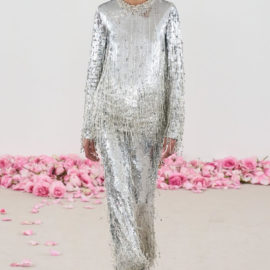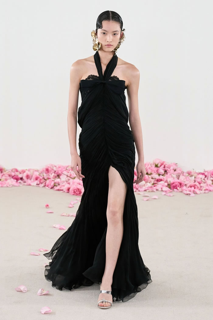 In a departure from his usual focus on womenswear, Valli introduced menswear to his lineup. Knit ribbed rompers reminiscent of Harry Styles’s personal style made an appearance, as well as a long semi-sheer tunic embellished with strands of gold sequins. Valli’s reputation for creating whimsical eveningwear remains intact, and he continues to dress a host of celebrities for red-carpet events. Among the front-row attendees, Ciara turned heads in a new-season polka dot sheer dress.
