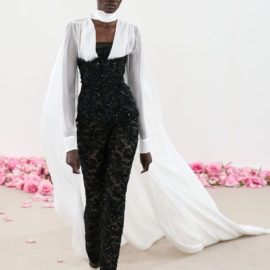 Surprisingly, it was the more down-to-earth looks that captured the attention of this collection. The marabou feather-studded cropped white jeans, when paired with practical moto boots instead of vertiginous heels, brought a modern sense of ease to the more traditional cocktail-hour ensembles.