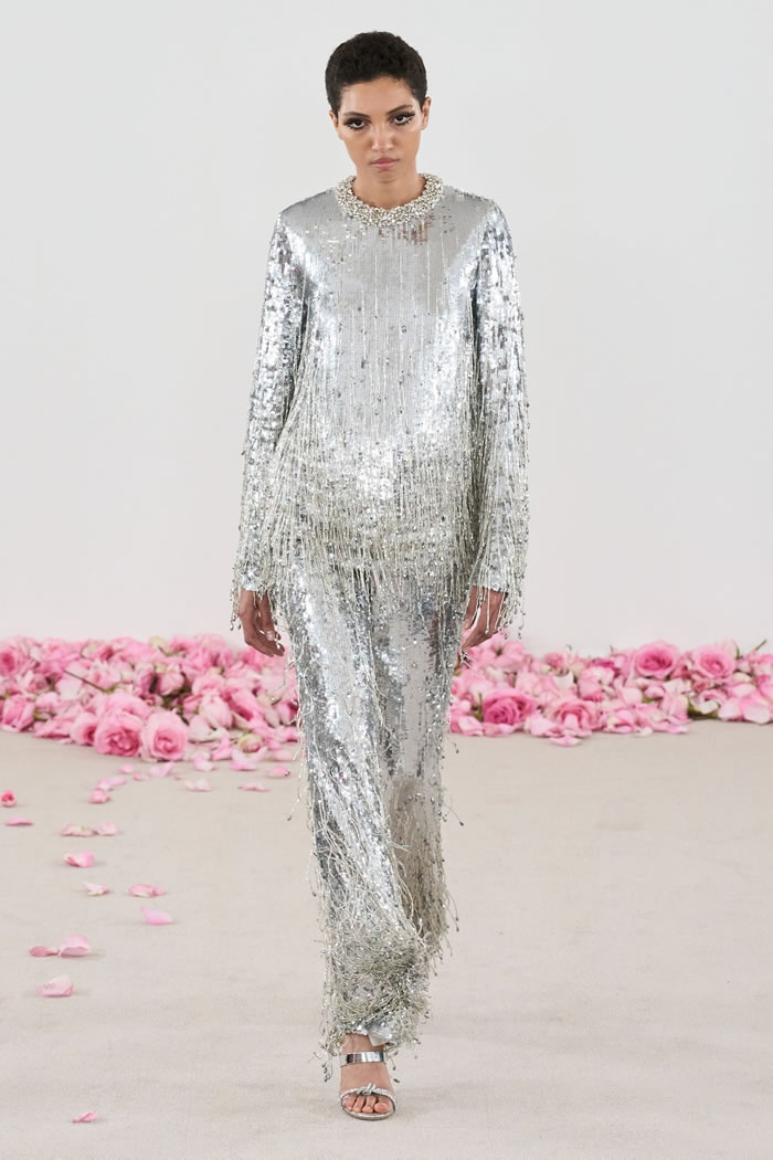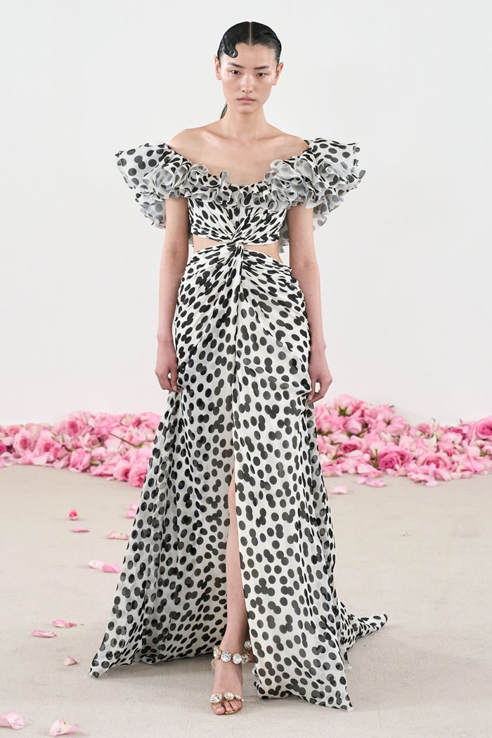 In a departure from his usual focus on womenswear, Valli introduced menswear to his lineup. Knit ribbed rompers reminiscent of Harry Styles’s personal style made an appearance, as well as a long semi-sheer tunic embellished with strands of gold sequins. Valli’s reputation for creating whimsical eveningwear remains intact, and he continues to dress a host of celebrities for red-carpet events. Among the front-row attendees, Ciara turned heads in a new-season polka dot sheer dress.
