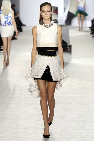 Giambattista Valli went mainly short, sharp and sculptural, which shouldn’t be a problem for slender and leggy ladies like Elena Perminova, Miroslava Duma and Sutton Stracke, who sat in his front row. Building on a base of ivory brocades, Valli gave each minidress an individual character by colorblocking with fabrics or strategically placed panels of embroidery.