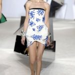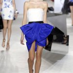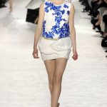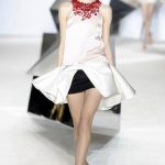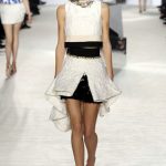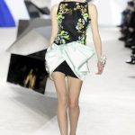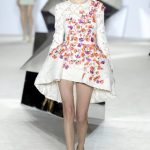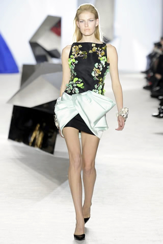 Giambattista Valli went mainly short, sharp and sculptural, which shouldn’t be a problem for slender and leggy ladies like Elena Perminova, Miroslava Duma and Sutton Stracke, who sat in his front row. Building on a base of ivory brocades, Valli gave each minidress an individual character by colorblocking with fabrics or strategically placed panels of embroidery.