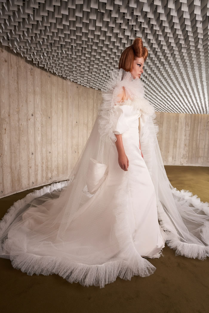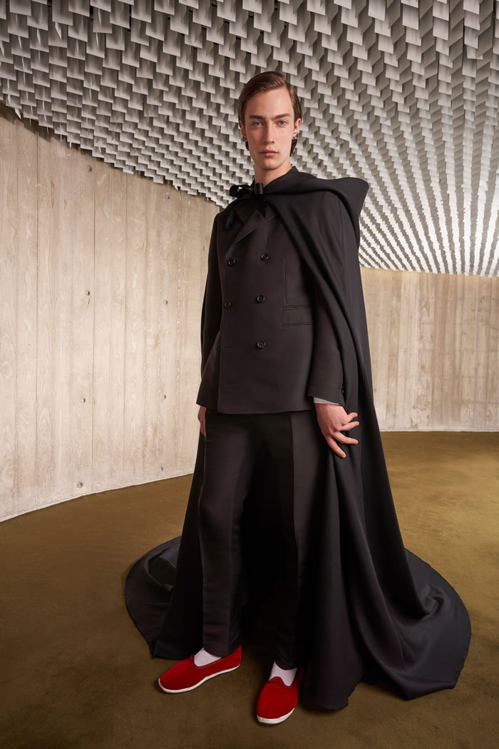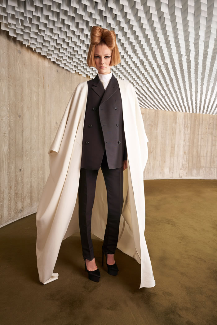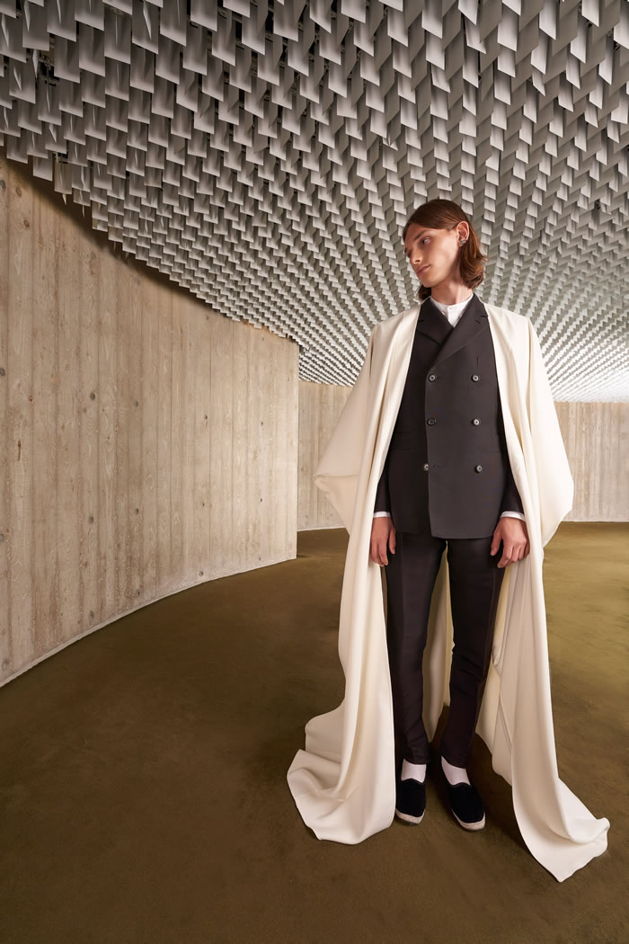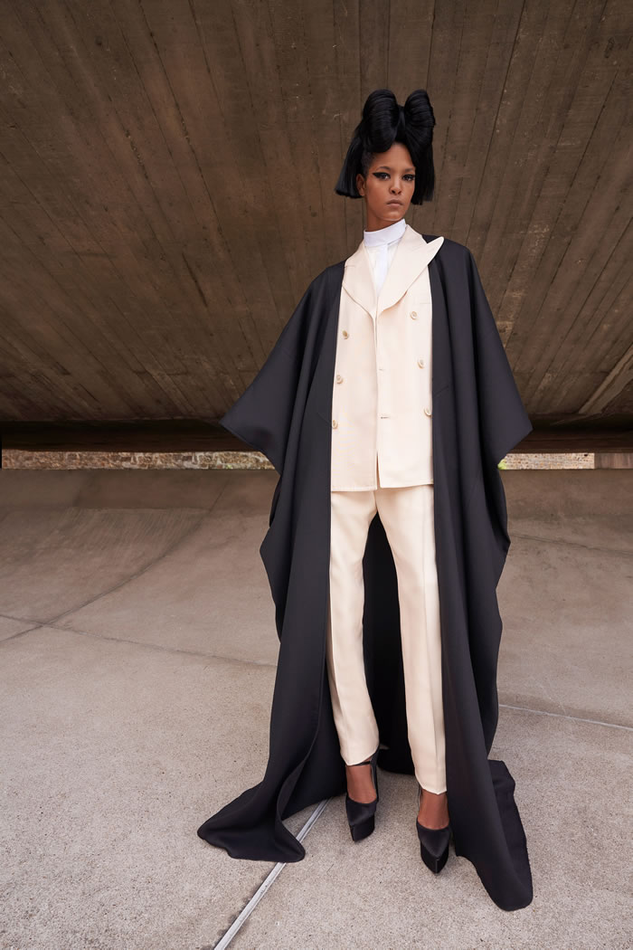 Across from them, another mood was lurking in the shadows: an obscured ballroom dress swathed in black tulle, a severely tailored shantung trouser suit dramatically covered in a black silk crêpe cape, and a clerical men’s ensemble composed of a black linen caftan with a matching cape.