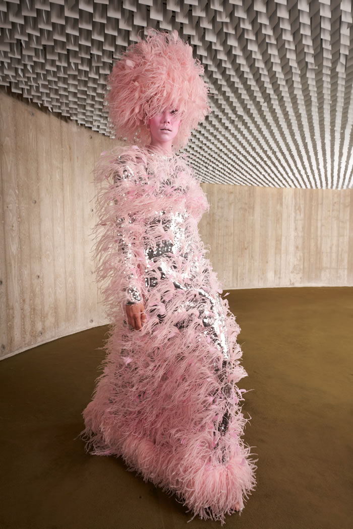 Frothy tulle cloud dresses nonchalantly draped chiffon gowns, and frivolously plumed sequined column dresses threw their pastel lightness around the showroom like there wasn’t a care in the world.