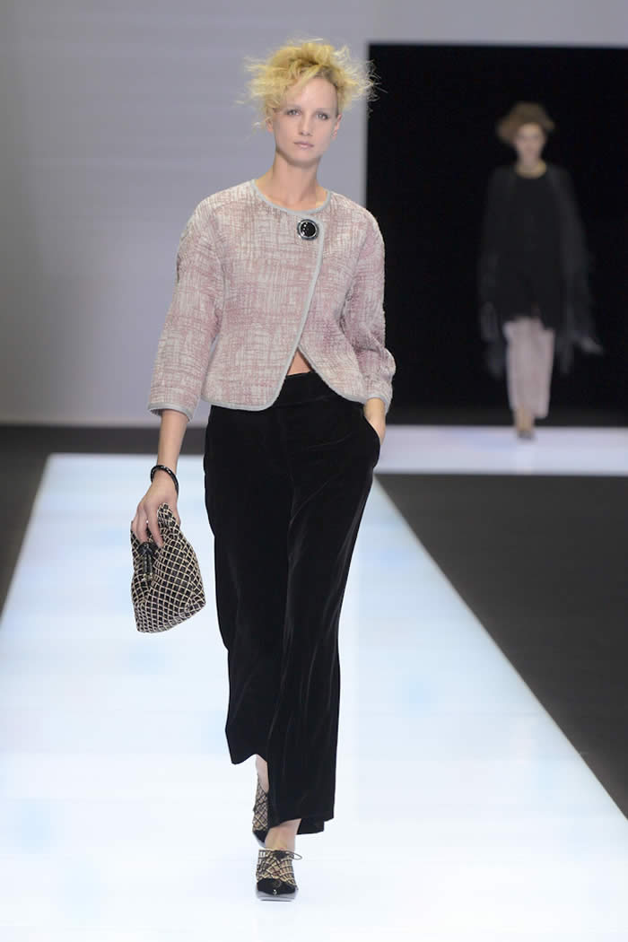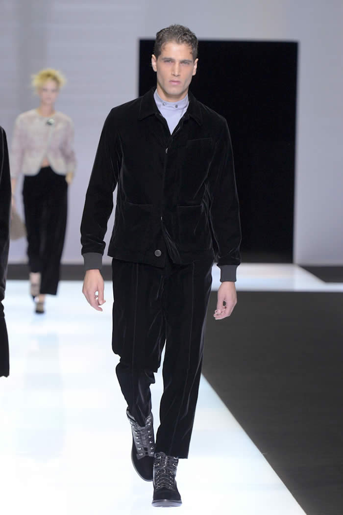 And by his lights, real women dressing for real life don’t want trickery and excess. Hen announced his season’s platform in the collection’s title, “Black Velvet.” “After the euphoria of color, the vanity fair seen over the past two years, I felt we should cleanse ourselves of this need to surprise through a palette of colors and a mix of fabrics,” Armani said after his show. “Velvet is decipherable in a clear way and is sophisticated. Customers don’t have a book with instructions. Italian fashion is envied by everybody, we shouldn’t try to overdo it.”