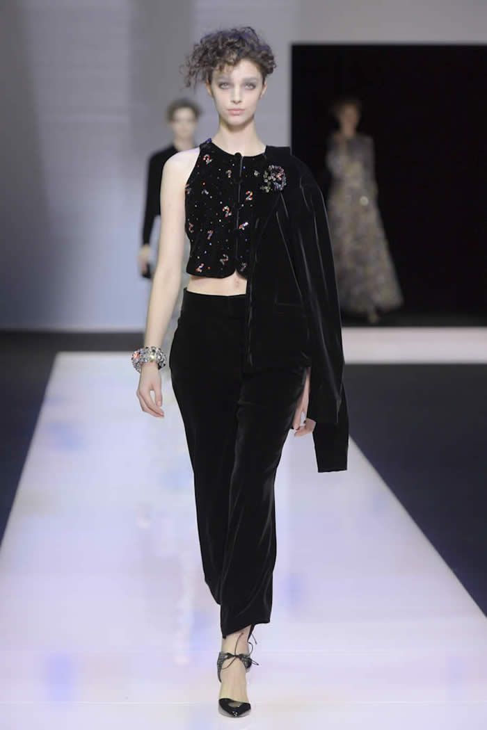 And by his lights, real women dressing for real life don’t want trickery and excess. Hen announced his season’s platform in the collection’s title, “Black Velvet.” “After the euphoria of color, the vanity fair seen over the past two years, I felt we should cleanse ourselves of this need to surprise through a palette of colors and a mix of fabrics,” Armani said after his show. “Velvet is decipherable in a clear way and is sophisticated. Customers don’t have a book with instructions. Italian fashion is envied by everybody, we shouldn’t try to overdo it.”