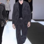 Thus, he ordered up black velvet bolts by the bushel and got to work. He made a bold case for the validity of velvet by day, most often in pants matched to pale tweed jackets, though he also showed snappy men’s wear-inspired suitings in taupe tweeds with just a touch of the soft stuff, on jacket pocket flaps. Perhaps because the fabric was the collection’s unifier, Armani felt free to diversify his silhouettes. His jackets ranged from loose and swingy to sleekly tailored, and pants, from classic trousers to a fluid shape cuffed at the ankle, to an experimental take: pants with colorful tweed tuxedo stripes running down the inner leg. Lest you wonder, these paired with matching jackets, the lineup’s strongest shot of color.
