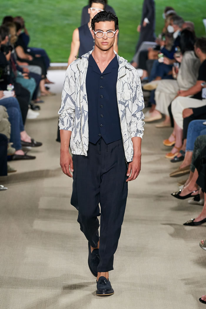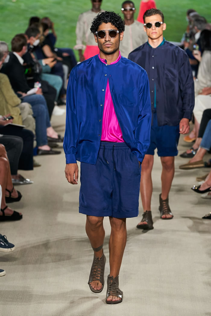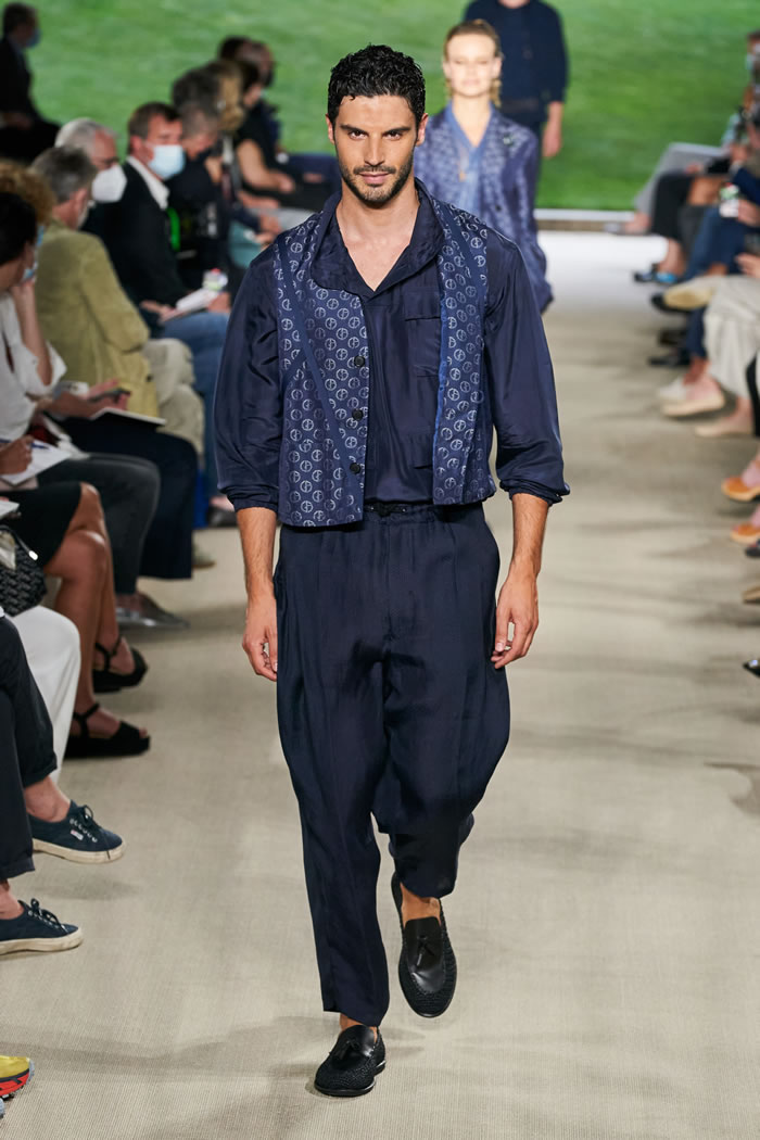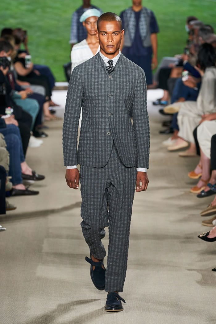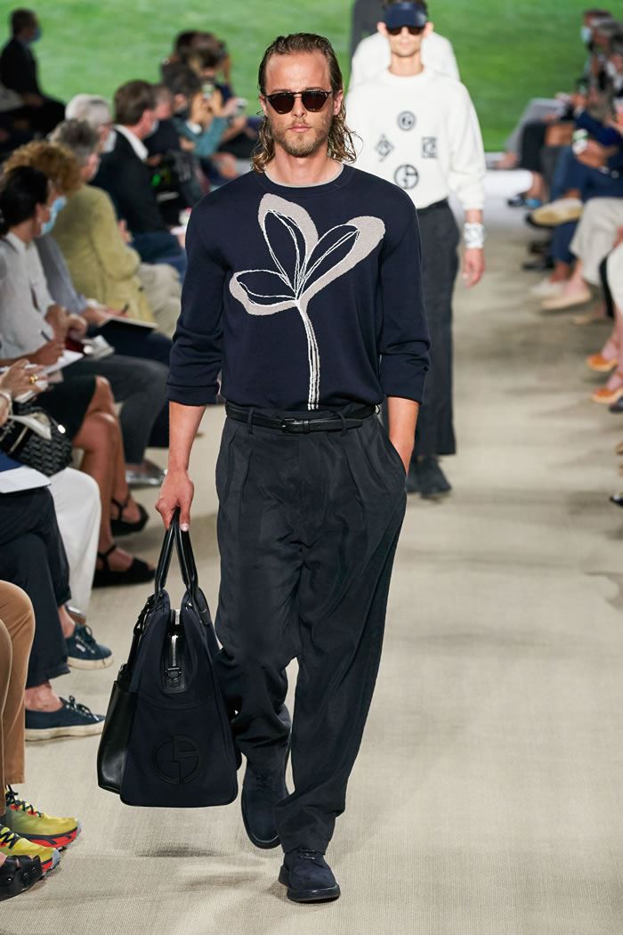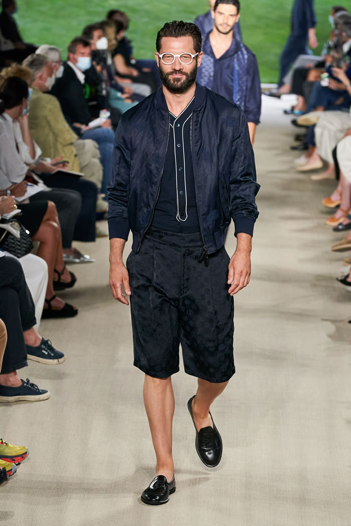 While wardrobe revolutions are perhaps more relative on Armani’s runway—the men’s mini-skorts proposed elsewhere this week were replaced by somewhat roomier shorts here—the pandemic’s impact on the designer is palpable.