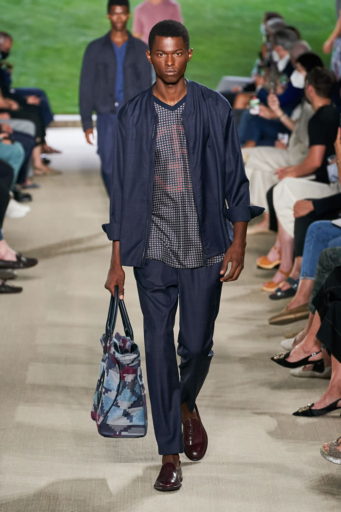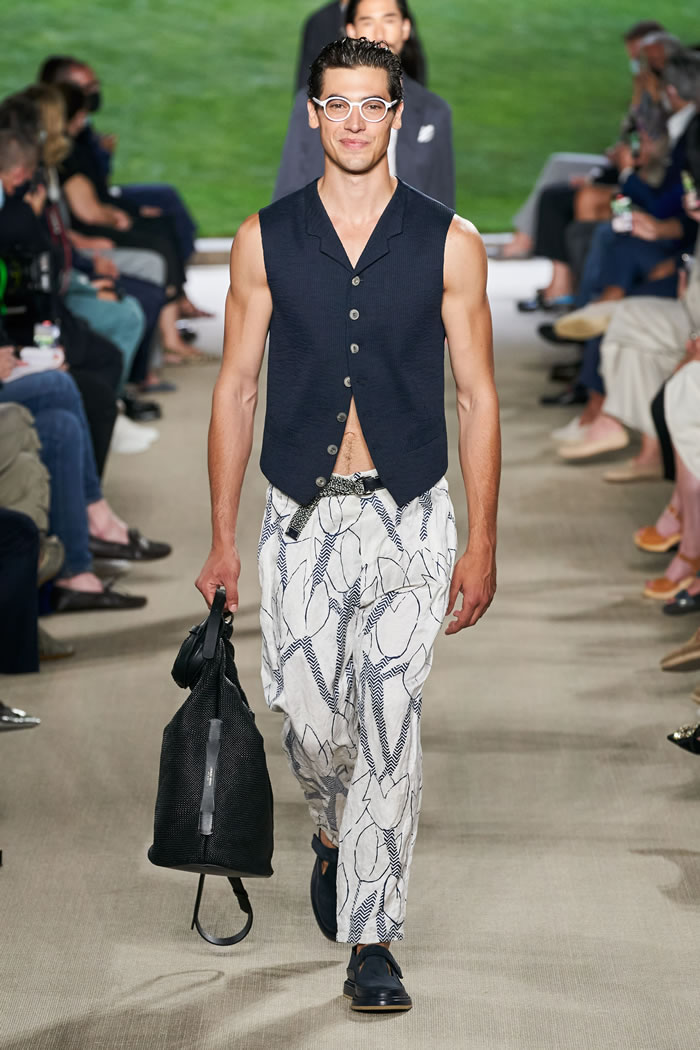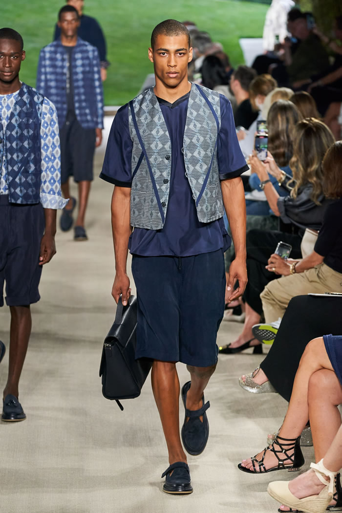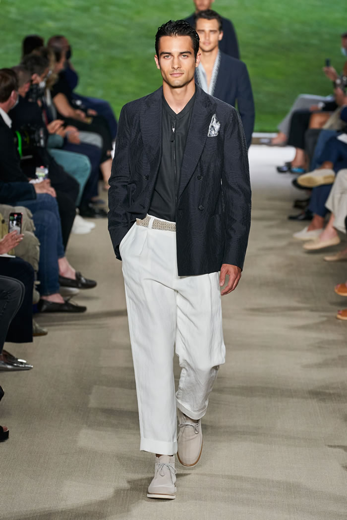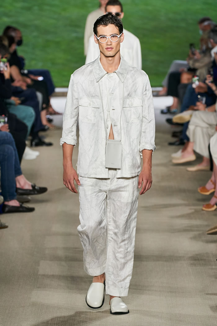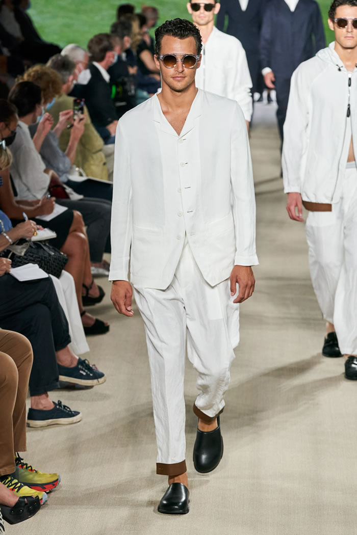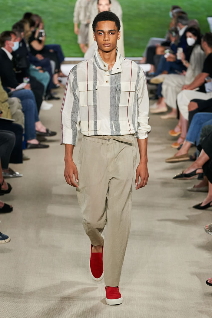 While wardrobe revolutions are perhaps more relative on Armani’s runway—the men’s mini-skorts proposed elsewhere this week were replaced by somewhat roomier shorts here—the pandemic’s impact on the designer is palpable.