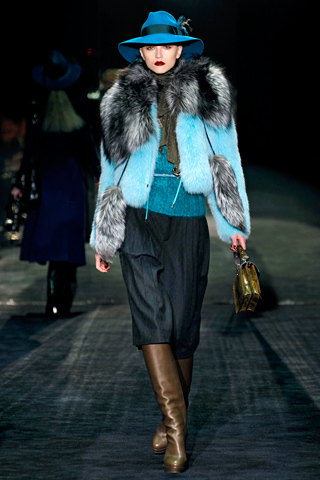 The latest fall collection 2011 by Gucci opened with a longhaired goat jacket in jade green over a bright blue blouse which perfectly contrasted with the stole shapes in silk flowers, each petal and there were millions, hand painted and hand sewn, yet all gave a fanciful sight to watch. See the complete collection for fall 2011 fashion modelled at Milan Fashion Week Fall 2011.