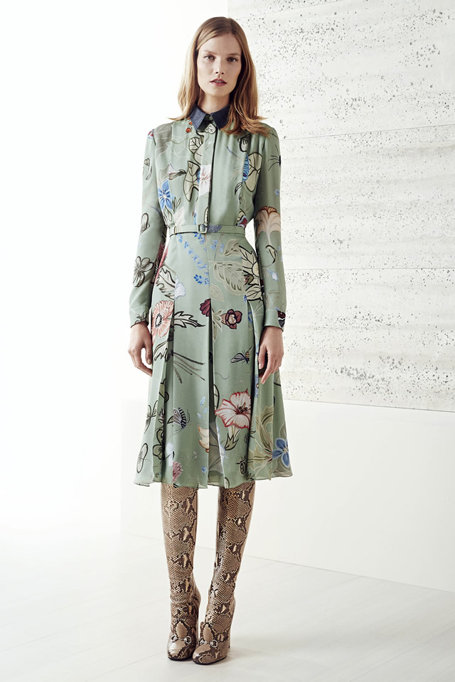 Over the course of the last several months, Frida Giannini has endured persistent rumors that she would exit Gucci. The designer denied them publicly in May. At her Resort presentation today, she made her position clear in another way, partnering with the artist Kris Knight on a floral print featuring plants that have historically been used by women to seduce, command power over men, and otherwise provide protection. "I went beyond the flower box and picked botanicals that either blossomed at night, dawn, or dusk, but also chose plants that have strong roots for adaptability, persistence, and resistance in harsh environments," Knight said in a press release. Plenty of subtext to read into that if you’re looking for it. Writ large, the print was very pretty, not unlike the Flora print with which Giannini made her name at Gucci in the mid-aughts. And the below-the-knee slip and chemisier dresses (with detachable collars) on which the print appeared were undeniably charming, among the best of the Resort season so far.