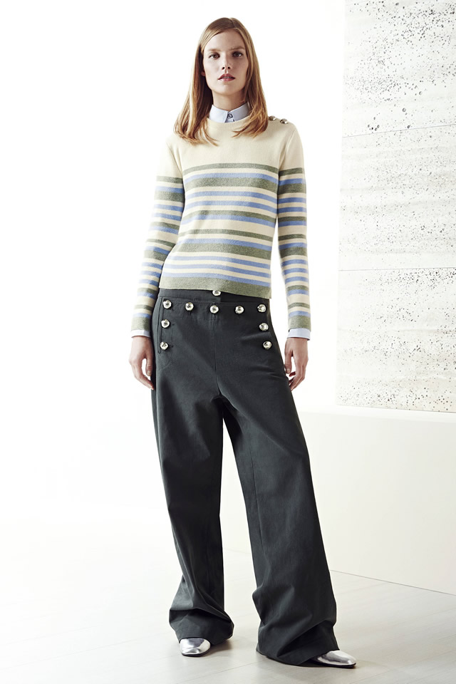 Giannini is coming off a terrific Fall show, and some of the pieces here, including the pastel peacoats and stacked-heel loafer boots, are developments from that collection. She extended the marinière metaphor with a striped sequin sweater and extremely low-slung sailor pants in a variety of fabrics, from stonewashed denim to black leather. A chambray shirt and equally casual jean skirt with coral embroideries rounded out this strong offering. Giannini knows that ultimately the clothes must speak for themselves, and what they had to say here was plenty persuasive.
