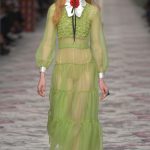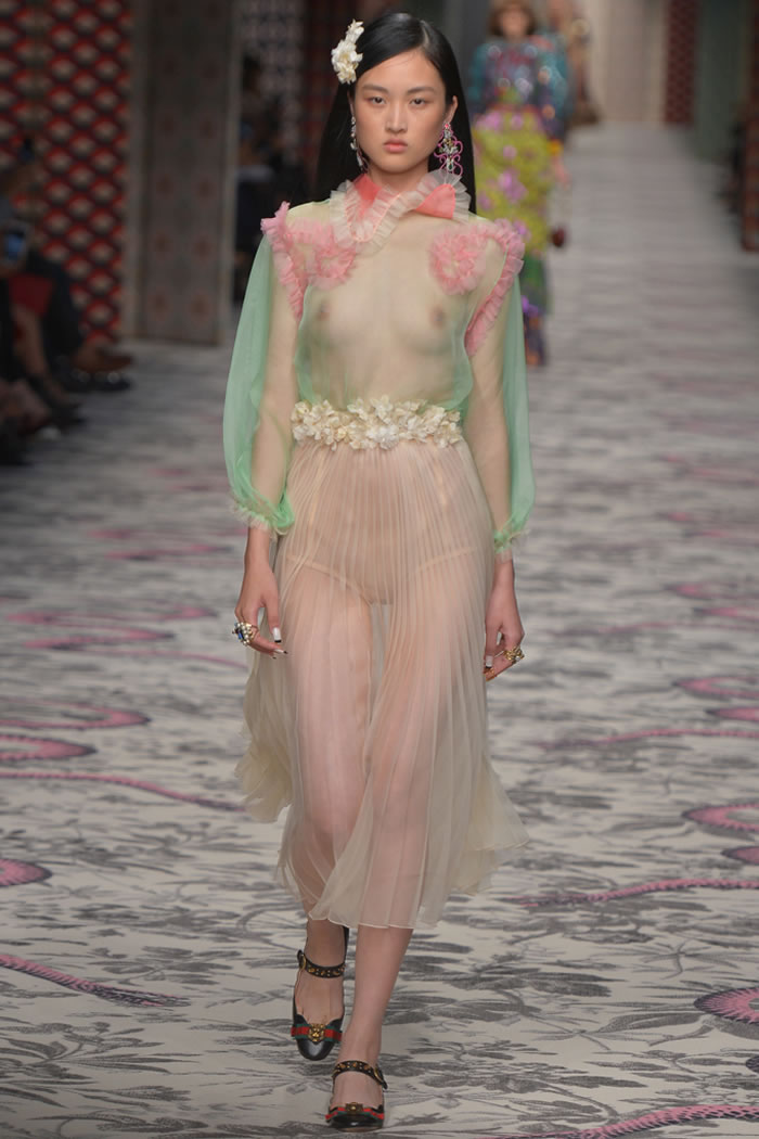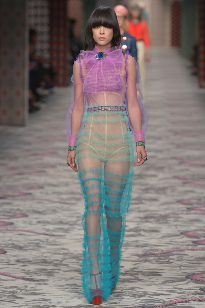 Much has been made of Michele’s nerdification of Gucci; this is not the Gucci Girl as she stormed the pop-culture vernacular back when. Yet there’s sensuality, too, in the overall delicacy of Michele’s approach, which, when rendered in transparent, pastel girlish froth, is even a bit twisted.