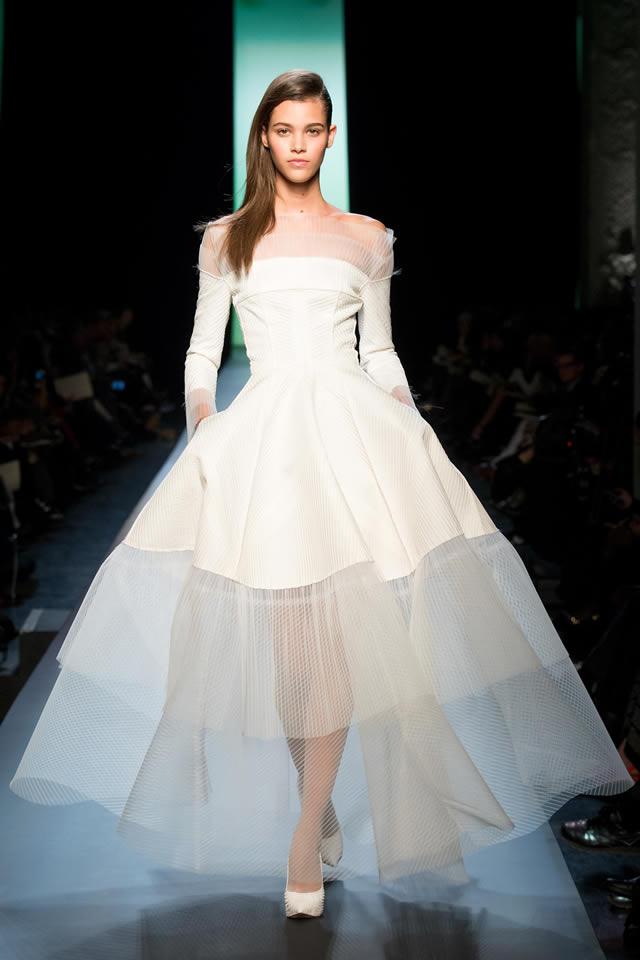 For fantasy silhouettes redolent of Asian mythologies, right down to sleeves that unfurled to the ground, she made patchworks out of antique Japanese obi belts, embroidered sacred Buddhist Thangka motifs and snow lotuses, and carved snow flurries out of kilometres of tulle.