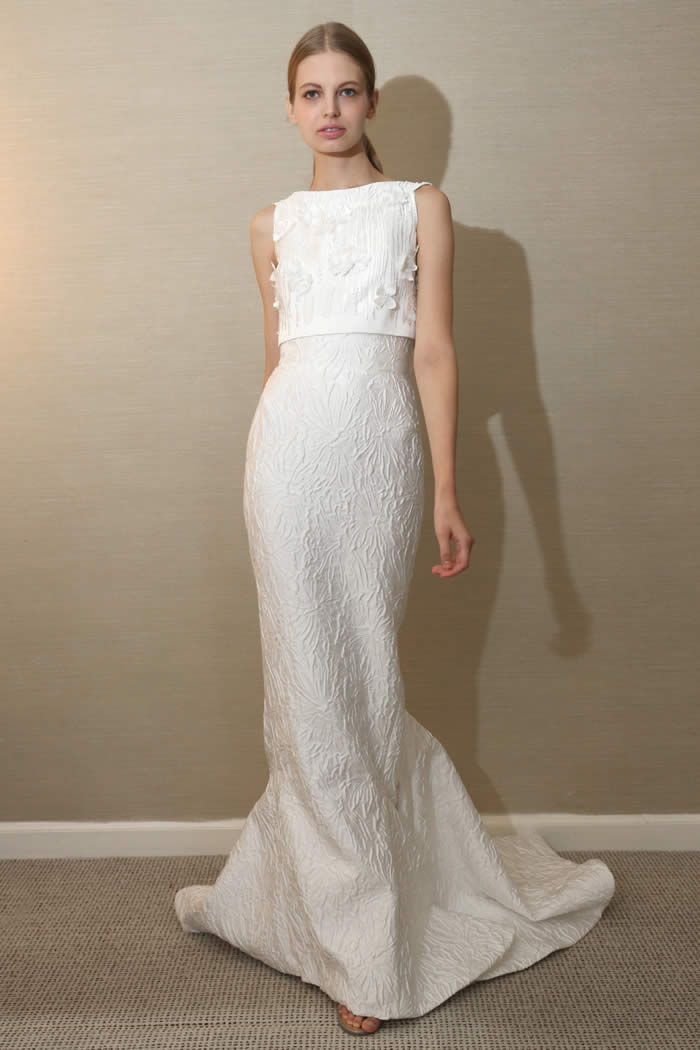 For his second bridal collection, Gustavo Cadile fused romance and sensuality in slinkier, more body-conscious silhouettes than in his debut lineup. There were eight new styles, including a floral silk jacquard mermaid skirt offered with either a sleeveless cropped top or a sheer, long-sleeve jacket covered in sparkling floral appliqués both options equally luxurious and modern.