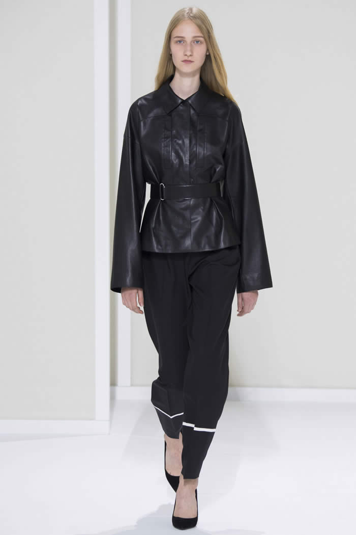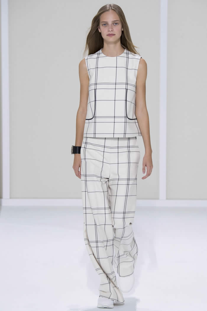 That urban sportiness infused the majority of the lineup, modernizing the Hermès essentials as they came. A streamlined black leather zip-up bodice worn with a black-and-white windowpane plaid skirt and sneakers made modern use of the house’s leather as ready-to-wear. Scarves took on a nautical ease as the navy and white Quadri scarf, with its large-scale abstract geometry, was used on a simple dress that looked like two pieces – a square top and straight skirt. The same pattern also appeared on a loose caftan dress.