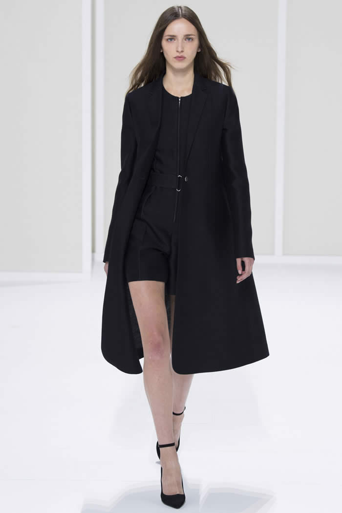 Spring had more of an edge, even if it was the edge of a silver spoon. The show began and ended with sharp, spare silhouettes, mostly stripped of adornment to let the fabric quality bask in purity of form. A group of midnight blue/black double-faced cashmere, cotton and silk blend, was cut into minimal separates with a smart, top-of-the-corporate-ladder polish. A long waistcoat and matching pants were worn over a white and navy swimsuit with a V-shaped strap down the center that made all the difference between plain and subtle style. The closing looks were equally clean but more casual in off-white double-faced linen cotton and silk that had a dense parchment look on a pert tennis shift and a long, racer-back tank dress worn with white sneakers.