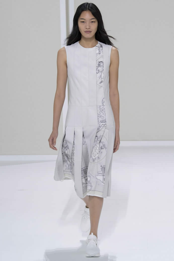 That urban sportiness infused the majority of the lineup, modernizing the Hermès essentials as they came. A streamlined black leather zip-up bodice worn with a black-and-white windowpane plaid skirt and sneakers made modern use of the house’s leather as ready-to-wear. Scarves took on a nautical ease as the navy and white Quadri scarf, with its large-scale abstract geometry, was used on a simple dress that looked like two pieces – a square top and straight skirt. The same pattern also appeared on a loose caftan dress.